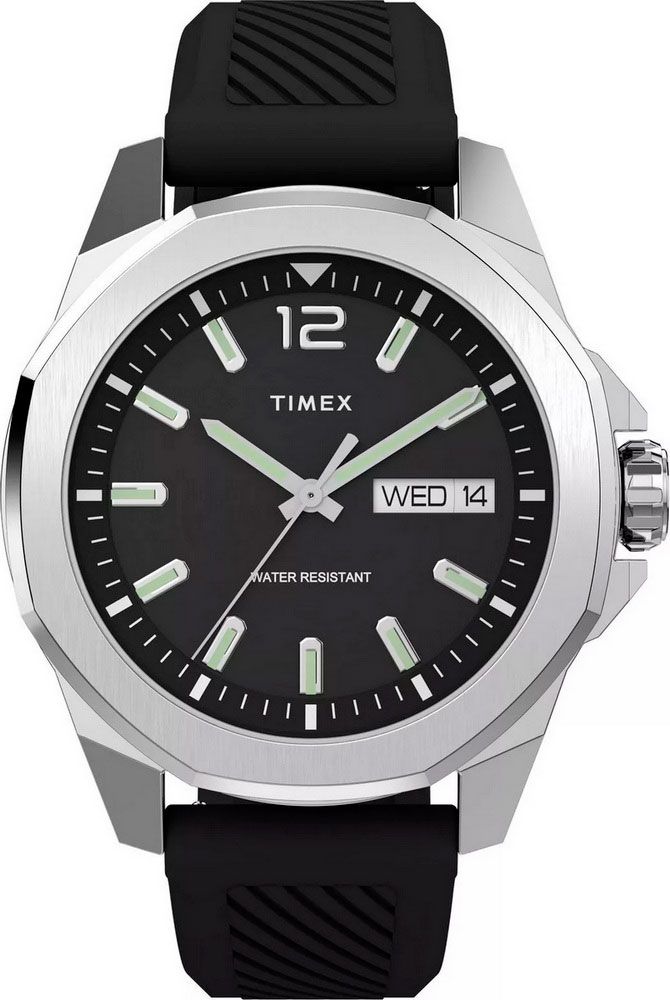 Мужские кварцевые аналоговые наручные часы. Коллекция Essex Avenue. Центральные часовая, минутная и секундная стрелки. Чёрный циферблат с часовыми индексами в виде штрихов и арабской цифры 12. Стрелки и метки с люминесцентным покрытием, которое светится в темноте после непродолжительного воздействия света. Окошко даты и дня недели в позиции 3 ч. Корпус из латуни с покрытием серебристого цвета. Диаметр корпуса 46 мм, толщина 10 мм. Восьмиугольный безель. Рифленая переводная головка c защитой. Чёрный пластиковый ремешок с классической застежкой buckle. Ширина ремешка 22 мм. Минеральное стекло устойчивое к мелким механическим повреждениям. Водостойкость WR 50 (мытьё рук, дождь).