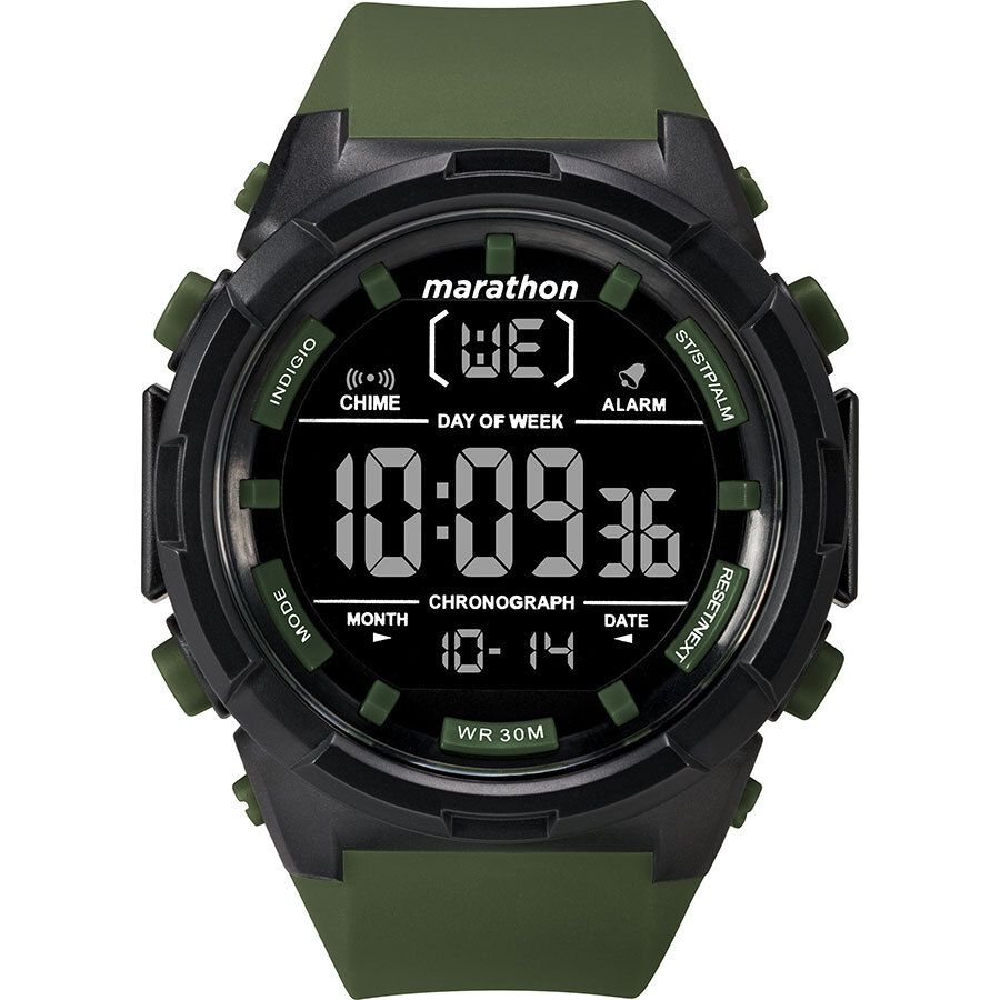 Мужские электронные часы. Отображение времени, даты. Секундомер. Будильник. Подсветка. Корпус выполнен из черного пластика. Диаметр корпуса составляет 50 мм. Зеленый силиконовый ремешок шириной 21 мм, стандартная застежка. Пластиковое стекло. Водостойкость WR 30 (брызги).