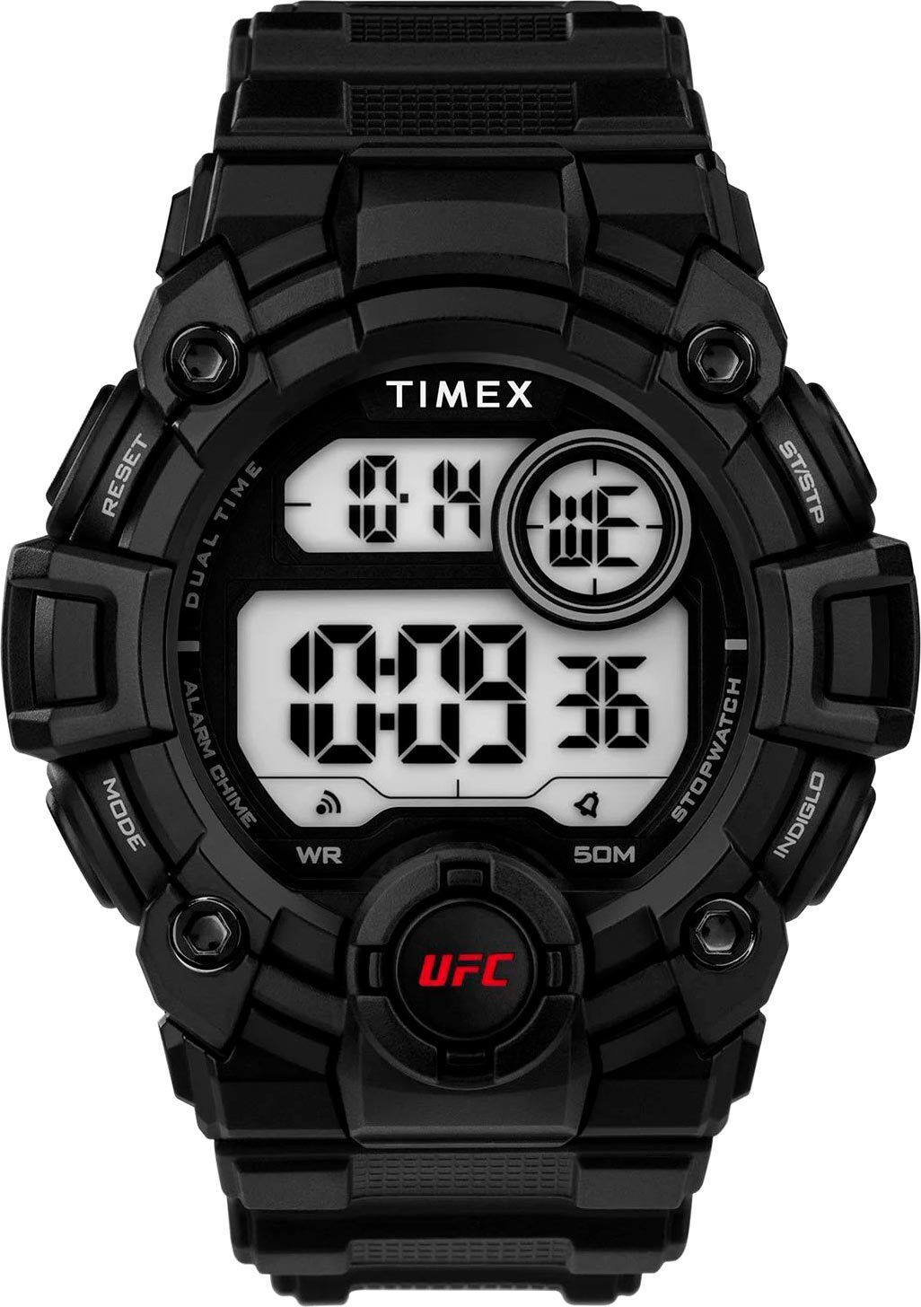 Мужские кварцевые электронные часы-хронограф с секундомером. Коллекция UFC Rematch. Специальная серия часов в сотрудничестве со спортивной организацией UFC, под эгидой которой проводятся бои по смешанным единоборствам (также известные как ММА). Секундомер с максимальным временем измерения 24 часа. SPLIT-хронограф. Таймер обратного отсчета до 24ч. Будильник. Второй часовой пояс. Автоматический календарь. Подсветка дисплея Indiglo (запатентованная технология компании Timex, представляющая собой электролюминесцентную панель, с помощью которой подсвечивается весь дисплей). Корпус из полимерного пластика чёрного цвета. Диаметр корпуса 50 мм. Чёрный пластиковый ремешок с классической застежкой. Ширина ремешка 22мм. Водозащита 50WR (мытьё рук, дождь).