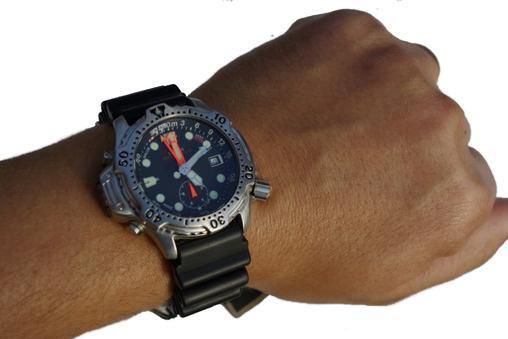 Корпус из нержавеющей стали, часы, минуты, секунды, индикация числа, секундомер, глубинометр на 55 метров с памятью максимального погружения, индикатор погружения, люминесцентные стрелки и метки, вращающийся безель, диаметр 40 мм, каучуковый ремешок (специальная конструкция для дайверов).