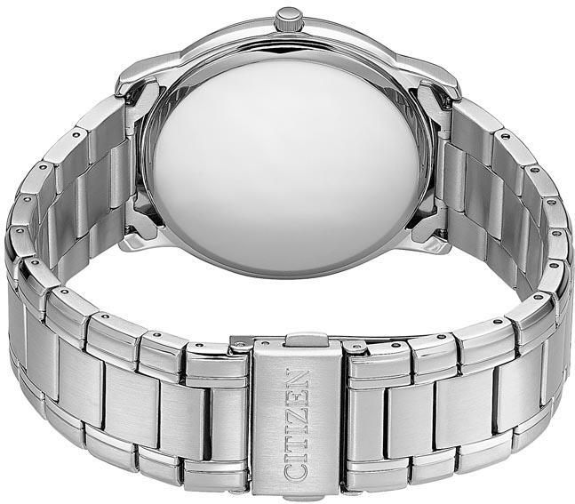 Мужские кварцевые аналоговые часы на солнечной батарее. Коллекция Eco-Drive. Калибр механизма Citizen J810. Часы оснащены системой питания и подзарядки от солнечной энергии Eco-Drive, не требующей замены батарейки. Система Eco-Drive - патентованная технология CIitizen, заключающаяся в размещении фотоэлементов скрытых под циферблатом и постоянно заряжающих аккумулятор часов при попадании солнечного света на циферблат. Функция информирования о недостаточном заряде и предотвращения перезарядки. Функция индикации заряда (EOL - End of Life) – в случае ослабевания заряда элемента питания, секундная стрелка двигается через два деления. Срок работы аккумулятора с полным зарядом до 240 дней. Примерный срок службы аккумулятора 10 лет. Центральные часовая, минутная и секундная стрелки. Апертура даты в позиции 3 часов. Синий циферблат с часовыми метками в виде штрихов. Круглый стальной корпус диаметром 42 мм, толщиной 9 мм. Устойчивое к мелким механическим повреждениям минеральное стекло. Стальной браслет с раскладывающейся застежкой. Ширина браслета 23 мм. Водонепроницаемость WR50 (мытьё рук, дождь). Вес примерно 124 г.