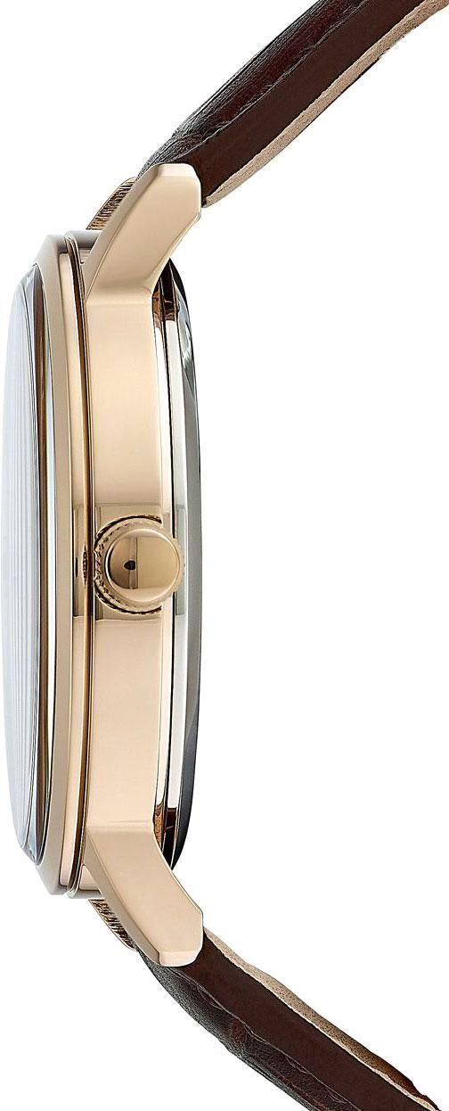 Мужские кварцевые часы на солнечной батарее с аналоговым отображением времени. Коллекция Eco-Drive. Калибр механизма Citizen E111. Часы оснащены системой питания и подзарядки от солнечного света Eco-Drive не требующей замены элемента питания. Система Eco-Drive - патентованная технология Citizen, заключающаяся в размещении фотоэлементов скрытых под циферблатом и постоянно подзаряжающих аккумулятор часов при попадании солнечного света на циферблат часов. Запас хода около 6 месяцев от полностью заряженной батареи. Функция индикации заряда (EOL - End of Life) – в случае ослабевания заряда элемента питания секундная стрелка двигается через 2 деления. Функция предотвращения перезарядки. Центральные часовая, минутная и секундная стрелки. Жёлтый циферблат с часовыми метками в виде штрихов. Минутная шкала на циферблате. Индикация даты в позиции 3 часов. Круглый корпус из нержавеющей стали с IP покрытием цвета розового золота. Диаметр корпуса 40 мм, толщина 10 мм. Устойчивое к мелким механическим повреждениям минеральное стекло. Коричневый кожаный ремешок с классической застёжкой buckle. Водонепроницаемость 50WR (мытьё рук, дождь). Вес около 47 г.