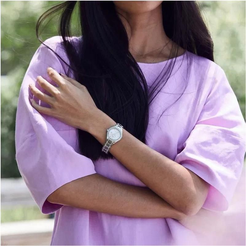 Кварцевые часы. Водостойкость WR 50. Система Eco-Drive не требующая замены батарейки. Центральные часовая, минутная и секундная стрелки. Индикация даты. Циферблат с часовыми индексами в виде штрихов и цифр. Корпус выполнен из нержавеющей стали. Диаметр корпуса 30 мм, толщина 8 мм. Устойчивое к возникновению мелких механических повреждений минеральное стекло. Браслет выполнен из нержавеющей стали. Часы украшены кристаллами.