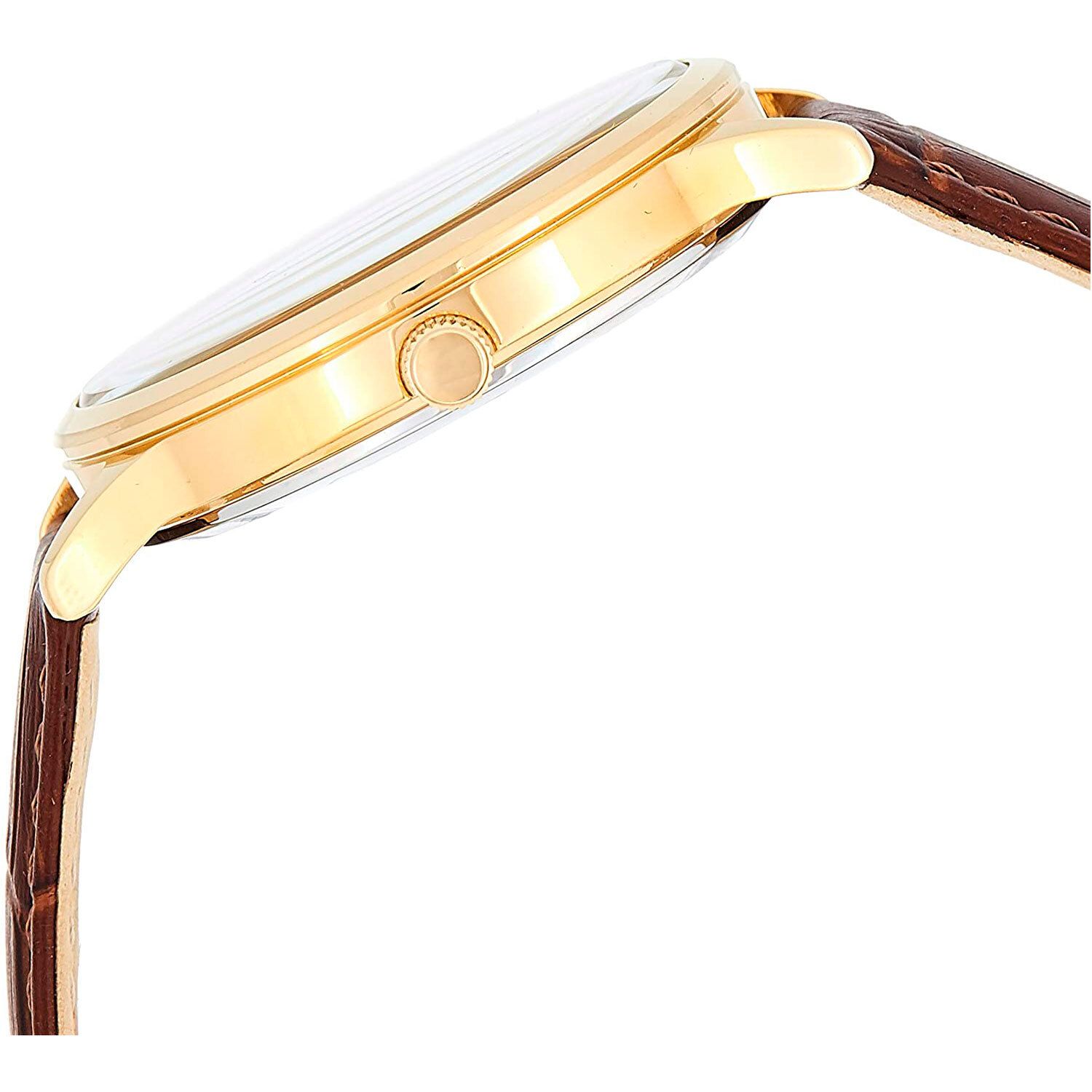 Мужские кварцевые часы. Точный японский механизм Seiko. Калибр 7N42. Точность хода +/- 15 секунд в месяц. Центральные часовая, минутная и секундная стрелки. Апертура даты в позиции 3 часов. Бежевый циферблат с узором гильоше. Круглый корпус выполнен из полированной нержавеющей стали с PVD покрытием цвета желтого золота. Диаметр корпуса составляет 40 мм, толщина 10 мм. Ремешок коричневого цвета шириной 18 мм из кожи теленка с классической застежкой. Закаленное минеральное стекло повышенной прочности Hardlex с антибликовым покрытием устойчиво к мелким механическим повреждениям. Водостойкость WR 100 (плавание без погружения).