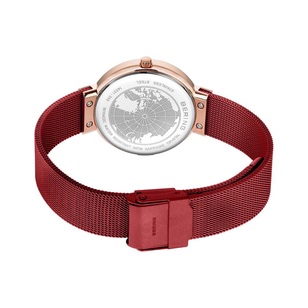 Женские кварцевые часы. Механизм MIYOTA 9T22.Водозащита 5 ATM. Плоское сапфировое стекло. Стальной корпус с полировкой и сатинажем, с IP-покрытием розовое золото. Диаметр 31мм. Красный циферблат с гильошированием в виде солнечных лучей. Браслет миланское плетение красного цвета 14мм. Застежка с фиксатором.