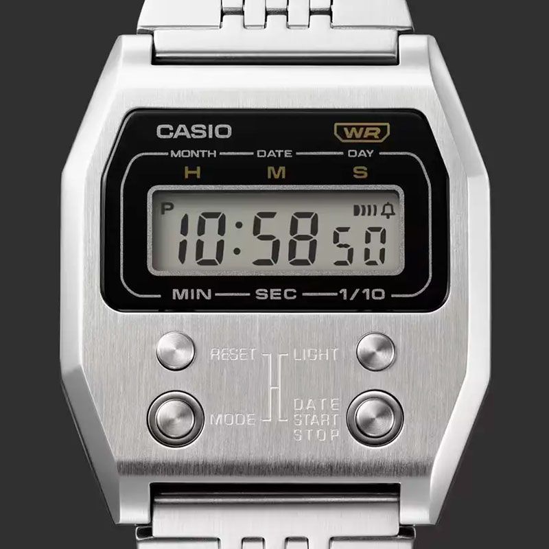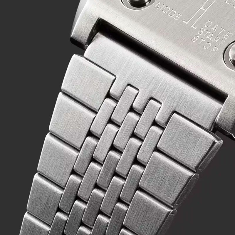 Электронные кварцевые наручные часы с секундомером. Коллекция Vintage. Унисекс. Светодиодная подсветка. Секундомер с точностью измерения 1/10 с и пределом измерения 60 мин. Ежедневный будильник, ежечасный сигнал. Автоматический календарь (28 дней на февраль). Устойчивое к мелким механическим повреждениям минеральное стекло. Прямоугольный корпус из нержавеющей стали. Размеры корпуса 40×35 мм, толщина 9,1 мм. Стальной браслет с раскладывающейся застёжкой. Водостойкость WR 30 (брызги). Вес около 90 г.