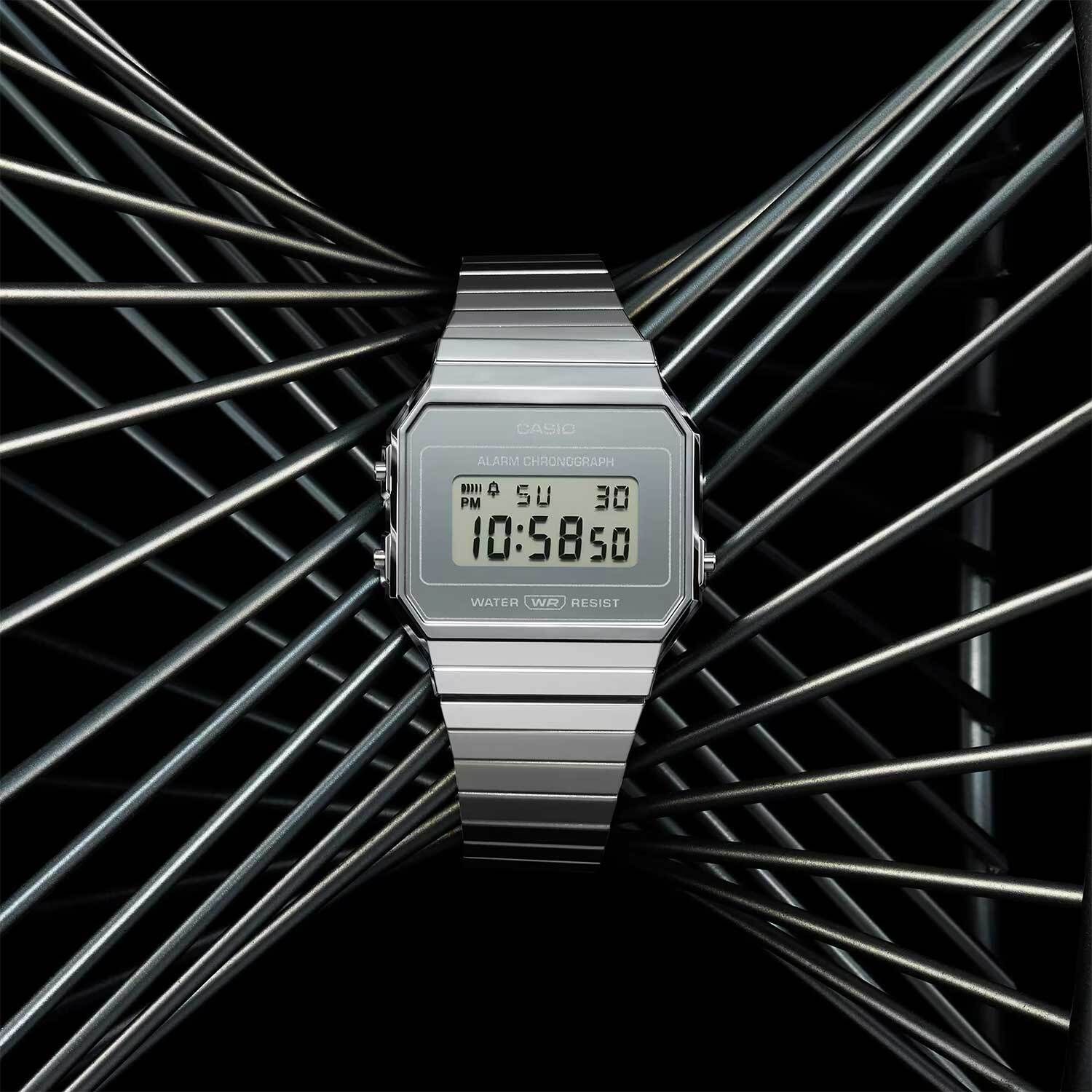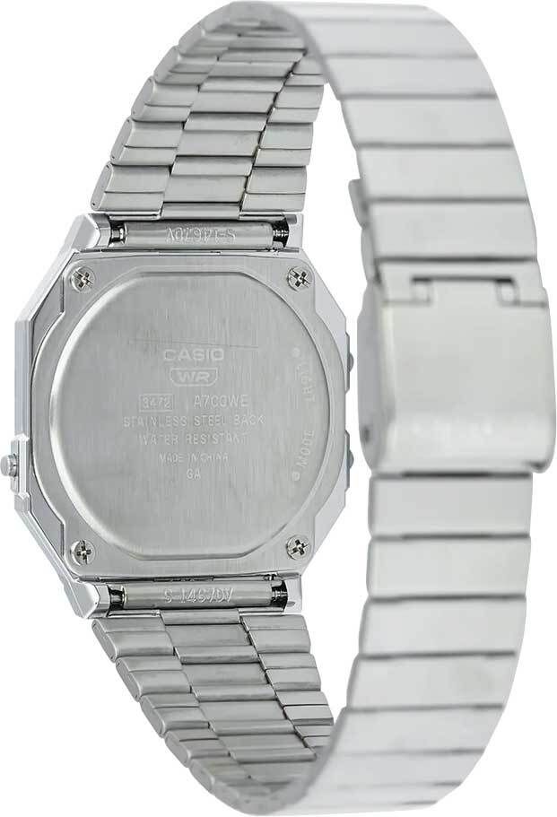 Электронные кварцевые наручные часы. Коллекция Casio Vintage. Унисекс. Секундомер с точностью показаний 1/100 секунды и временем измерения 1 час. Режимы измерения: прошедшее время, промежуточное время, два финишных результата. Ежедневный будильник, ежечасный сигнал. 12/24-часовой формат отображения времени. Циферблат подсвечивается светодиодом/. Автоматический календарь с установкой 28 дней на февраль. Прямоугольный пластиковый корпус серебристого цвета. Размеры корпуса 35,5 мм на 37,4мм, толщина 6мм. Пластиковое стекло. Стальной браслет миланского плетения с регулируемой застежкой. Срок службы батареи около 3 лет. Водостойкость WR 30 (брызги). Вес около 50 г.