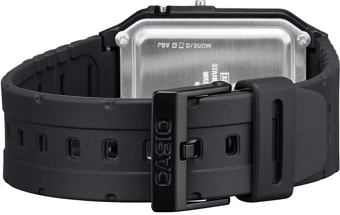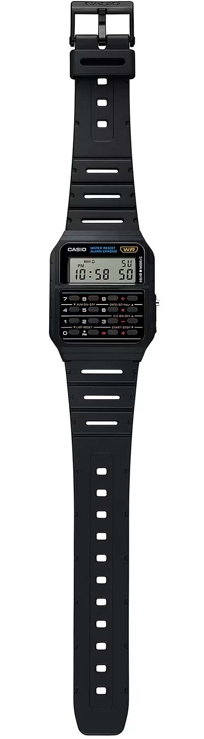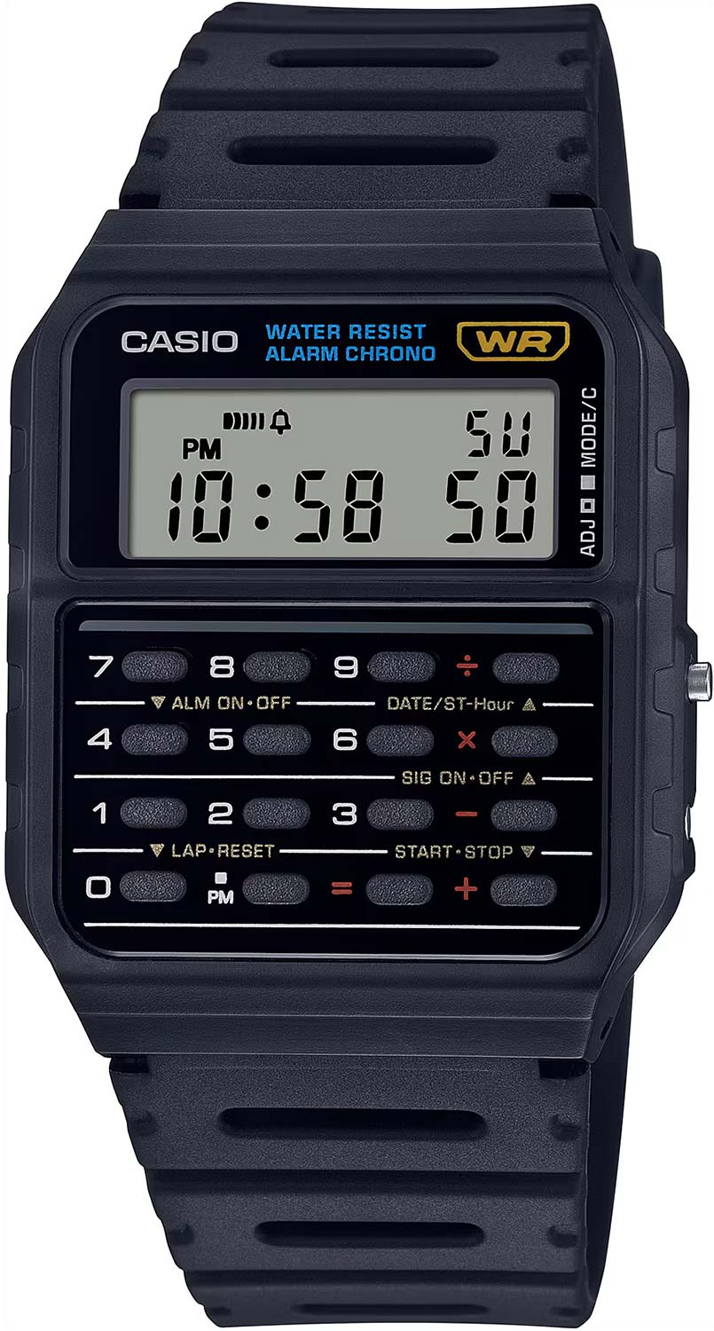 Легендарные часы для поклонников фильма «Назад в будущее», именно такую модель носил Марти Макфлай. Кварцевые наручные часы с цифровым отображением времени. Серия EDGY. Унисекс часы. Калькулятор позволяет производить различные математические вычисления, используя числа, содержащие до 8 знаков. Второй часовой пояс. 12-ти и 24-х часовой формат отображения времени. Секундомер с точностью показаний 1/100 секунды и временем измерения 24 часа. Режимы измерения: прошедшее время, промежуточное время, два финишных результата. Ежедневный будильник, ежечасный сигнал. Возможность включения/ выключения звука кнопок. Автоматический календарь до 2079 года. Прямоугольный чёрный пластиковый корпус. Размеры корпуса 34.4 мм на 43.2 мм, толщина 8.2 мм. Чёрный пластиковый ремешок с классической застежкой buckle. Батарея рассчитана на 5 лет. Водонепроницаемость 30WR (защита от брызг). Вес около 25 г.