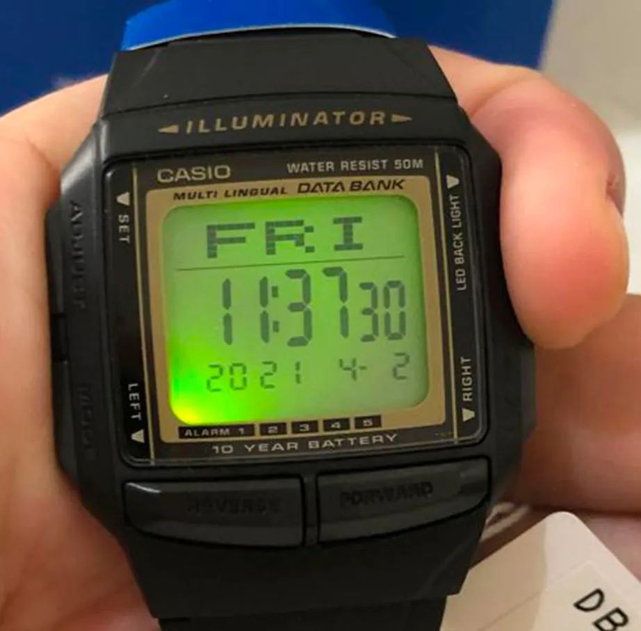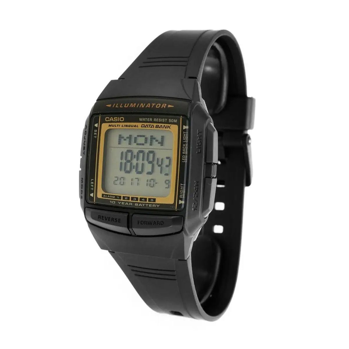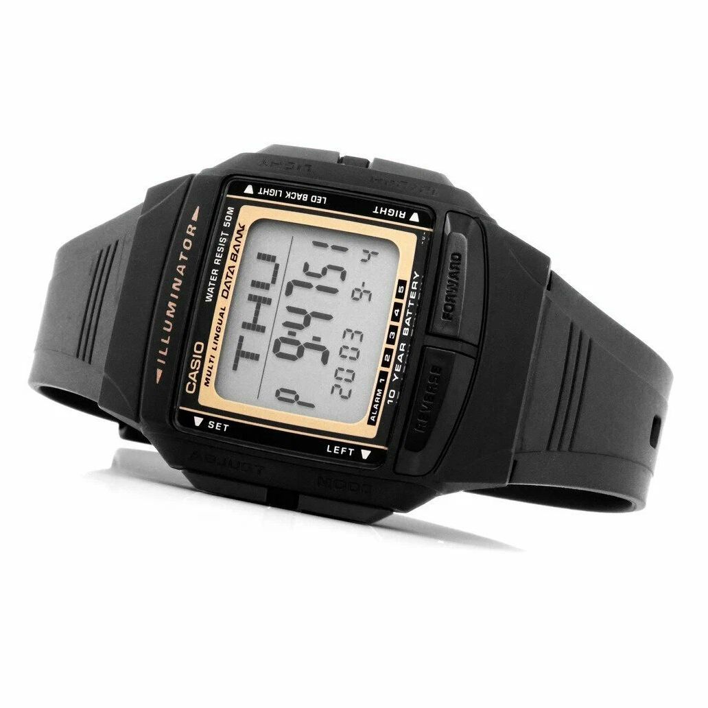 Мужские кварцевые электронные наручные часы. Серия Data Bank. Циферблат подсвечивается светодиодом с функцией послесвечения. 12-ти и 24-х часовой формат отображения времени. Записная книжка на 30 ячеек памяти для записи имен и телефонных номеров с функциями сортировки и отображения свободной памяти, каждая запись может включать в себя текст из 8 букв и 12 цифр. Ввод данных на 13 языках, включая русский. Второй часовой пояс. Секундомер с точностью показаний 1/100с и временем измерения 24ч. Таймер обратного отсчета от 1мин до 24ч. 5 независимых будильников (ежедневный, ежемесячный, каждый день определенного месяца, на определенную дату), один с функцией повтора сигнала Snooze, сигнал начала часа. Автоматический календарь до 2039 г. Режим Летнего времени (DST). Прямоугольный пластиковый корпус чёрного цвета. Размеры корпуса 36.6 мм на 43.2 мм, толщина 10.5 мм. Пластиковое стекло. Чёрный пластиковый ремешок с классической застежкой buckle. Батарейка рассчитана на 10 лет. Водонепроницаемость WR50 (мытьё рук, дождь). Вес около 27 г.