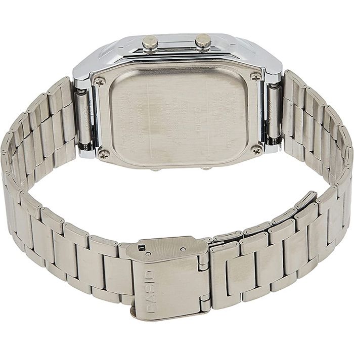 Мужские кварцевые электронные наручные часы. Серия Data Bank. Циферблат подсвечивается светодиодом с функцией послесвечения. 12-ти и 24-х часовой формат отображения времени. Записная книжка на 30 ячеек памяти для записи имен и телефонных номеров, каждая запись может включать в себя текст из 8 букв и 15 цифр. Ввод данных на 13 языках включая русский. Второй часовой пояс. Секундомер с точностью показаний 1/100с и временем измерения 24ч. Таймер обратного отсчета от 1мин до 24ч. 5 независимых будильников (ежедневный, ежемесячный, каждый день определенного месяца, на определенную дату), один с функцией повтора сигнала Snooze, сигнал начала часа. Автоматический календарь до 2039 г. Прямоугольный пластиковый корпус серебристого цвета. Размеры корпуса 37.7 мм на 43.1 мм, толщина 10.4 мм. Пластиковое стекло. Стальной браслет с регулируемой застёжкой. Батарейка рассчитана на 10 лет. Водонепроницаемость WR30 (защита от брызг). Вес около 58 г.