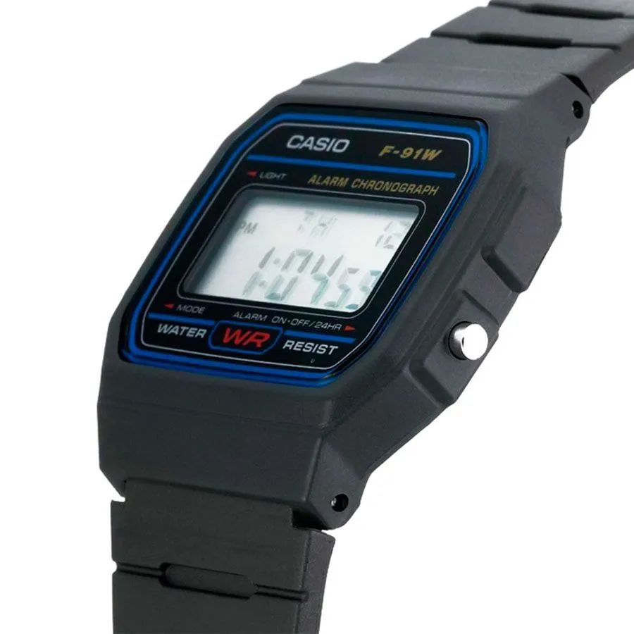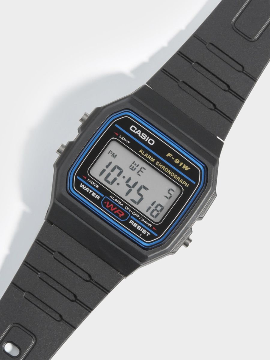 Кварцевые наручные часы с цифровым отображением времени в популярном ретро-стиле. Серия Casio Collection. Унисекс часы. Дисплей подсвечивается светодиодом. 12-ти и 24-х часовой формат отображения времени. Секундомер с точностью показаний 1/100 с и временем измерения 1ч. Режимы измерения: прошедшее время, промежуточное время, два финишных результата. Ежедневный будильник, ежечасный сигнал. Автоматический календарь с установкой 28 дней на февраль. Прямоугольный пластиковый корпус чёрного цвета. Размеры корпуса 38,2мм на 35,2 мм, толщина 8.5 мм. Пластиковое стекло. Чёрный пластиковый ремешок с классической застежкой buckle. Батарея рассчитана на 7 лет. Стальная задняя крышка крепится на 4-х винтах. Водонепроницаемость WR30 (защита от брызг). Вес около 21 г.