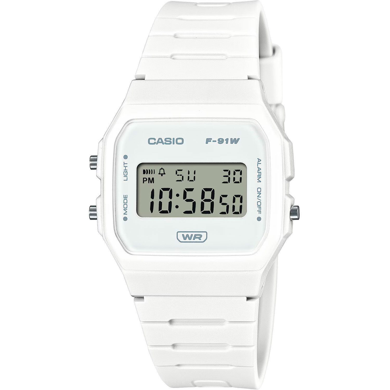 Кварцевые электронные наручные часы. Серия Casio Vintage. Унисекс. Дисплей подсвечивается светодиодом, цвет подсветки зеленый. 12-ти и 24-х часовой формат отображения времени. Секундомер с точностью показаний 1/100 с и временем измерения 1ч. Режимы измерения: прошедшее время, промежуточное время, два финишных результата. Ежедневный будильник, ежечасный сигнал. Автоматический календарь с установкой 28 дней на февраль. Прямоугольный пластиковый корпус белого цвета. Размеры корпуса 38,2мм на 35,2 мм, толщина 8.5 мм. Пластиковое стекло. Белый пластиковый ремешок с классической застежкой. Срок службы батареи около 7 лет. Водостойкость WR 30 (брызги). Вес около 21 г.