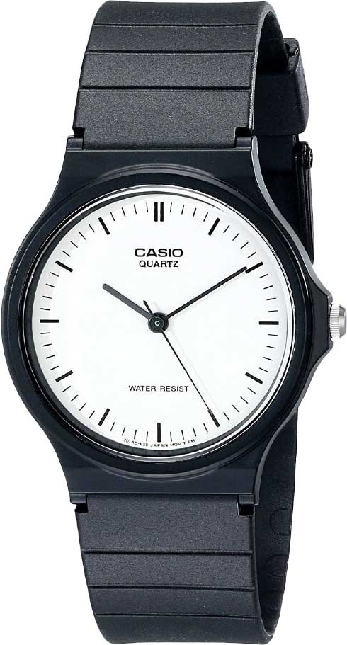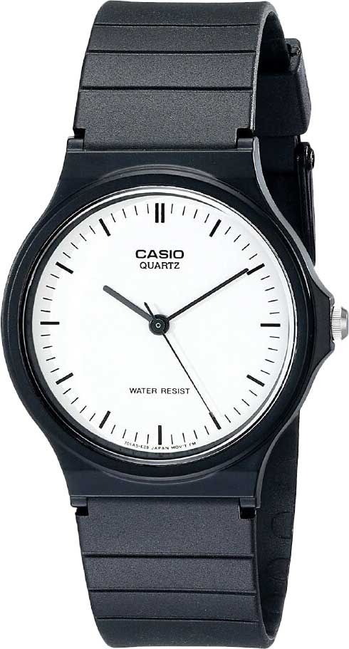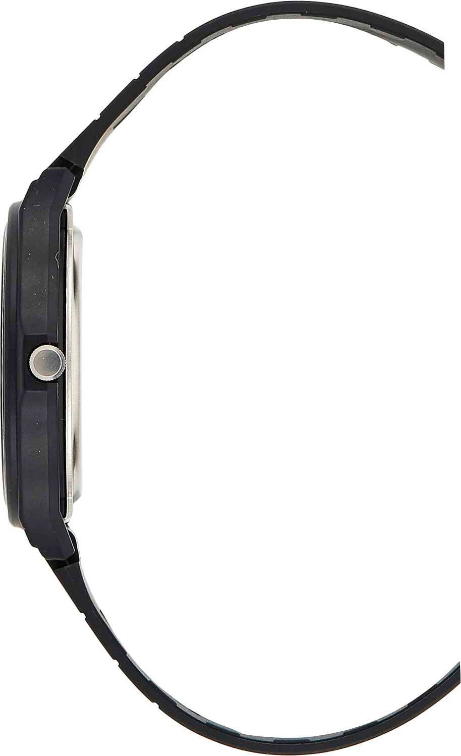 Кварцевые наручные часы c аналоговым отображением времени. Серия Casio Collection. Унисекс часы. Центральные часовая, минутная и секундная стрелки. Белый циферблат с часовыми метками в виде штрихов. Круглый корпус из полимерного пластика чёрного цвета. Размер корпуса 33,8 мм на 38,8 мм, толщина 7,8 мм. Пластиковое стекло. Чёрный пластиковый ремешок с классической застёжкой buckle. Батарейка рассчитана на 2 года. Водонепроницаемость 30WR (защита от брызг). Вес около 20 г