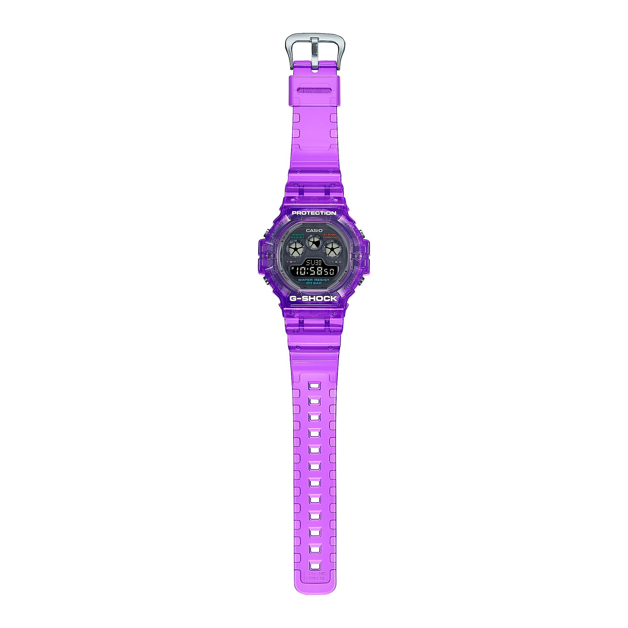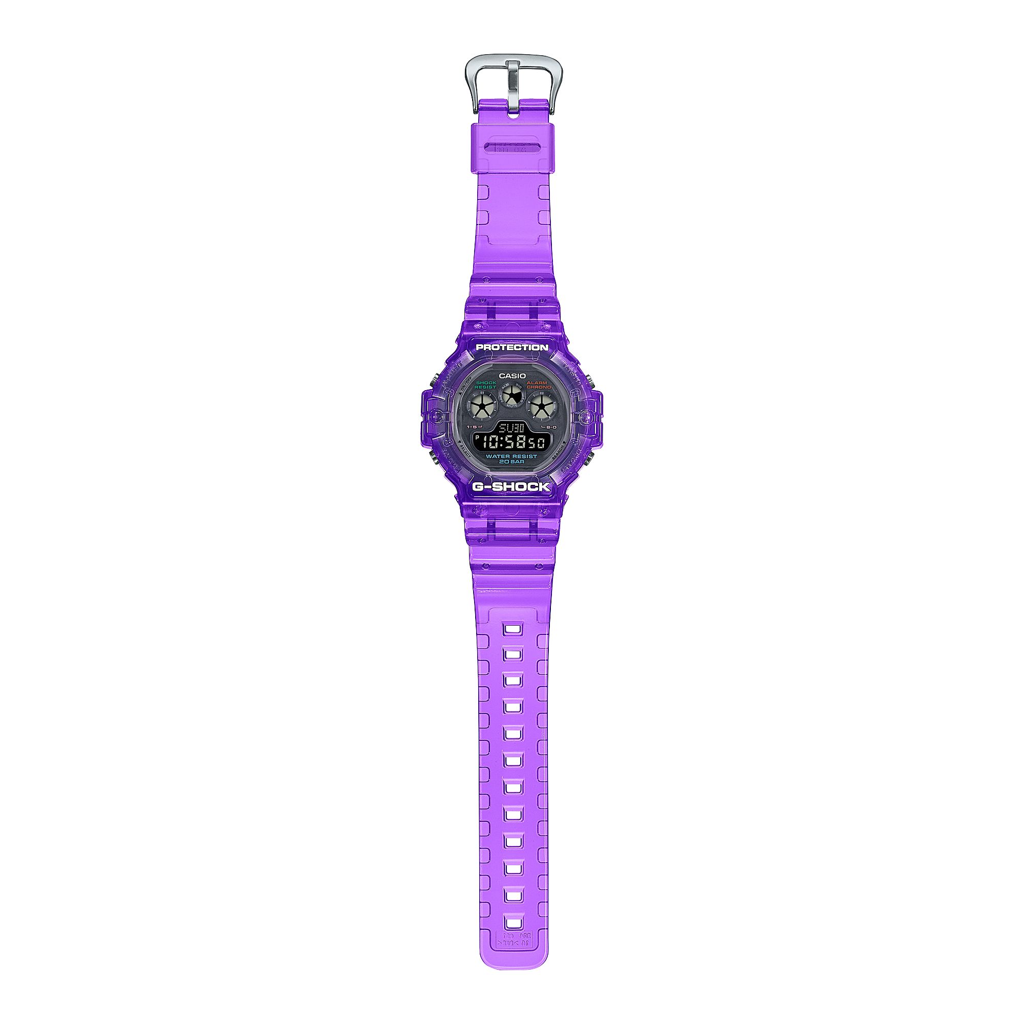 Кварцевые электронные наручные часы. Коллекция Casio G-Shock. Ударопрочная конструкция корпуса защищает механизм часов от ударов и вибраций. Электролюминесцентная подсветка циферблата с возможностью выбора времени свечения (1.5 или 3 секунды). Функция мирового времени - 48 городов (29 часовых поясов), Автоматический календарь до 2099 года, функция летнего времени (DST) времени 12/24-х часовой формат времени. 5 независимых будильников, один с функцией повтора сигнала, сигнал начала часа. Секундомер с точностью 1/100 секунды и измерением до 1 часа. Таймер обратного отсчета (диапазон времени 24 часа) с шагом 1 с. Функция выключения звука нажатия кнопок (Mute). Устойчивое к мелким механическим повреждениям минеральное стекло. Круглый корпус из полимерного пластика фиолетового цвета. Ремешок из полимерного пластика фиолетового цвета со стандартной застёжкой Buckle. Водонепроницаемость WR200 (ныряние без вкваланга)