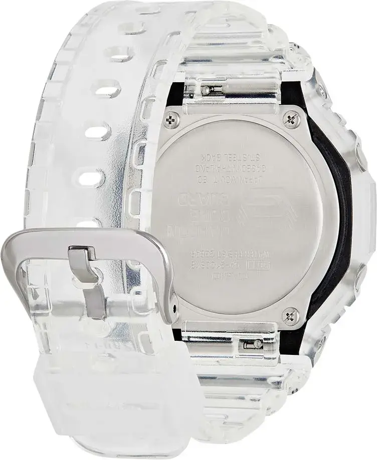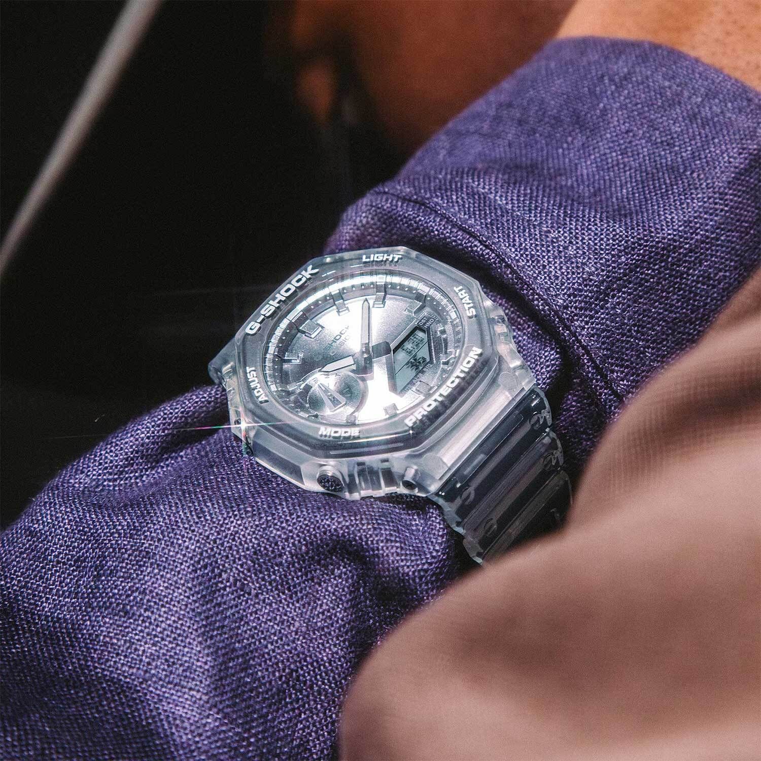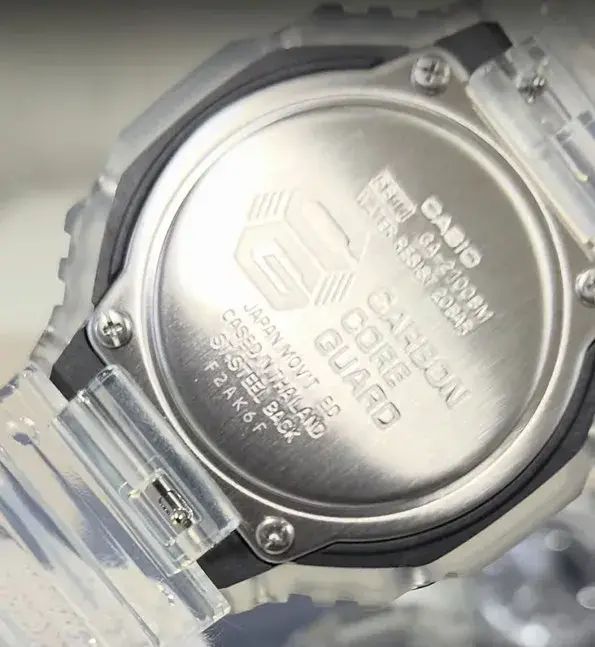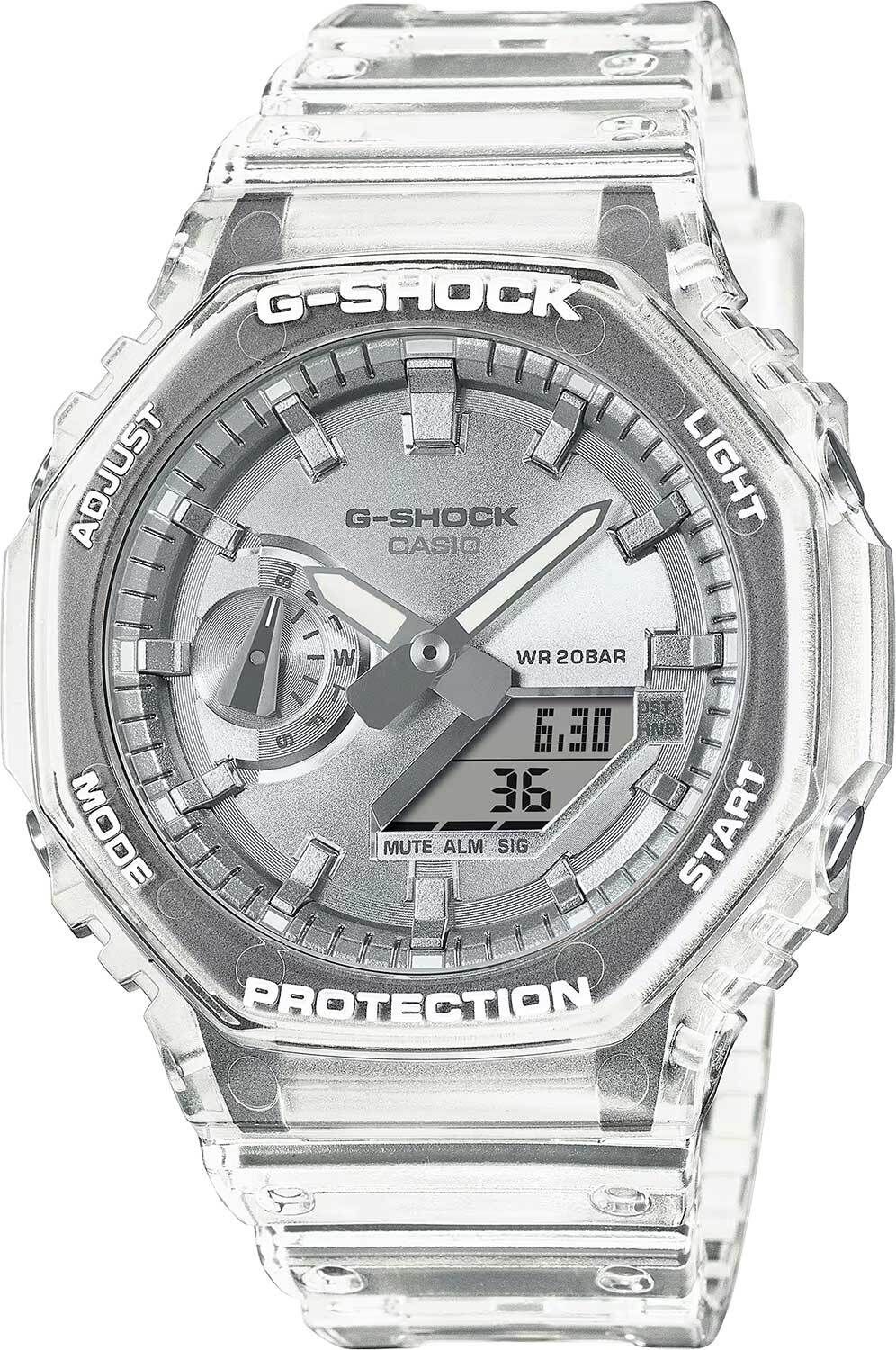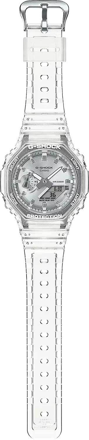 Кварцевые аналого-цифровые наручные часы. Серия G-Shock. Унисекс часы. Противоударный пластиковый корпус с углеродными волокнами (структура Carbon Core Guard) более прочный и в то же время более легкий, защищает механизм часов от ударов и вибраций. Двойная светодиодная подсветка обеспечивает подсветку не только цифрового дисплея, но и аналогового циферблата. Настройка продолжительности подсветки 1,5 или 3 секунды, послесвечение. Цвет подсветки белый. Светящееся покрытие стрелок обеспечивает длительное послесвечение в темноте после короткого воздействия света. 12-ти и 24-х часовой формат отображения времени. Секундомер с точностью показаний 1/100 с (первый час) и 1 с (после первого часа) и временем измерения 24 часа. Режимы измерения: прошедшее время, промежуточное время, два финишных результата. Таймер обратного отсчета от 1 секунды до 24 часов (с интервалом в 1 секунду) с автоповтором. Мировое время - 31 часовой пояс (48 городов), всемирное координированное время (UTC), включение/отключение летнего времени. 5 ежедневных будильников, ежечасный сигнал. Функция перемещения стрелок для удобного просмотра информации на цифровом экране. Ретроградный стрелочный указатель для недели вынесен на дополнительный малый циферблат в позиции 9 ч. Функция отключения/включения звука кнопок. Автоматический календарь до 2099 года. Усиленный углеродными волокнами восьмиугольный корпус из полупрозрачного пластика. Размер корпуса 45,4 мм на 48,5мм, толщина 11,8мм. Устойчивое к мелким механическим повреждениям минеральное стекло. Серебристый циферблат с часовыми метками в виде штрихов. Белый полупрозрачный пластиковый ремешок со стандартной застёжкой Buckle. Примерный срок службы батареи 3 года. Водонепроницаемость 200WR (плавание и ныряние без акваланга). Вес около 51 г.