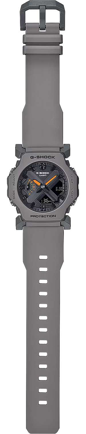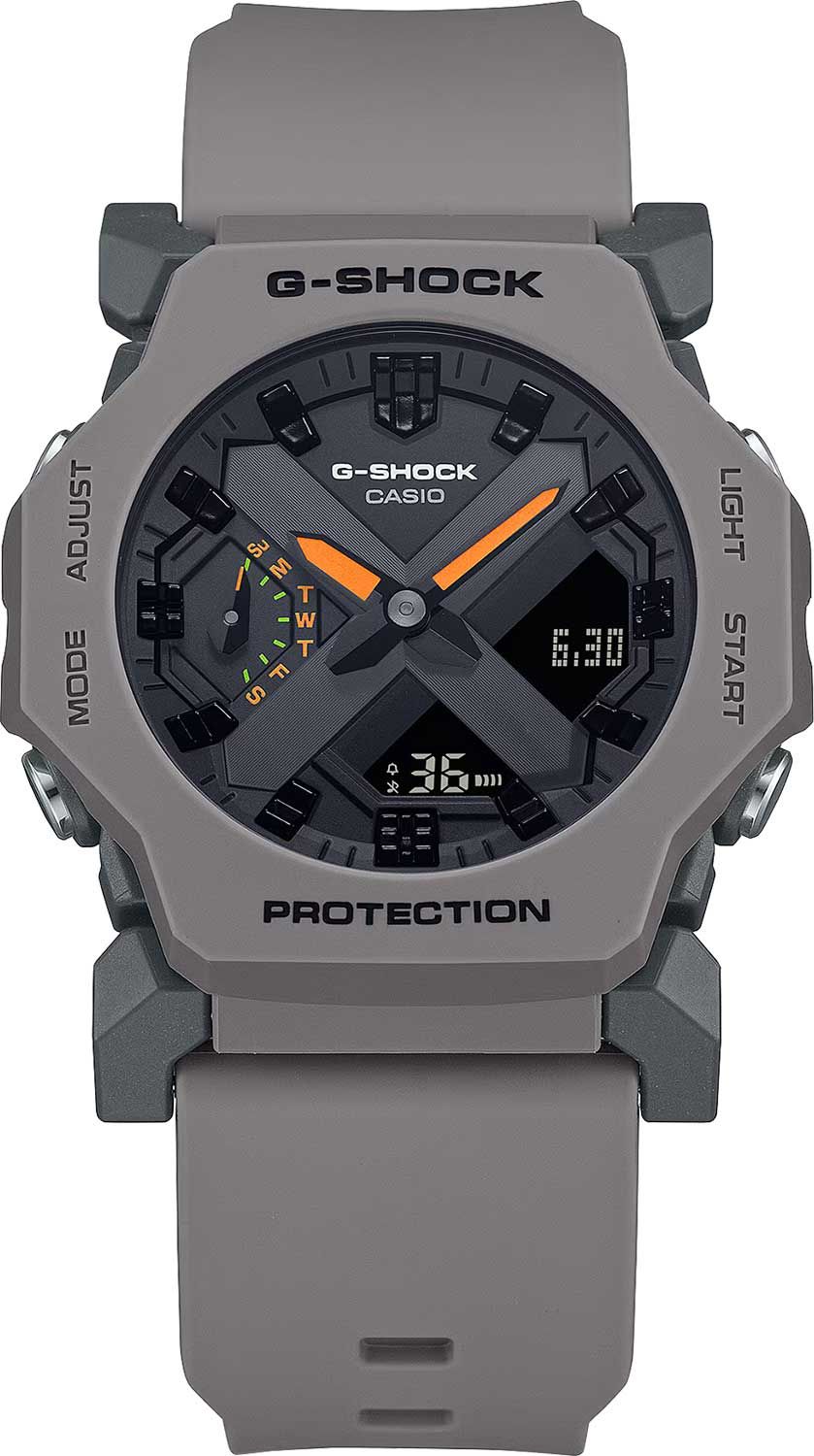 Кварцевые наручные часы с аналого-цифровым отображением времени. Серия G-Shock. Унисекс часы. Ударопрочный корпус защищает механизм часов от ударов и вибрации. Двойная светодиодная подсветка обеспечивает подсветку не только цифрового дисплея, но и аналогового циферблата. Настраиваемое послесвечение 1,5 или 3секунды. Цвет подсветки белый. Светящееся покрытие стрелок обеспечивает длительное послесвечение в темноте после кратковременного воздействия света. Мировое время - 31 часовой пояс (48 городов), всемирное координированное время (UTC), включение/отключение летнего времени. Секундомер с точностью измерения 1/100 секунды (первые 60 минут), 1 секунда (после 60 минут), и временем измерения 24 ч. Режимы измерения: прошедшее время, промежуточное время, два финишных результата. Таймер обратного отсчёта от 1 секунды до 24 часов (с интервалом в 1 секунду) с автоповтором. 10-секундный сигнал об окончании обратного отсчета. 5 ежедневных будильников, ежечасный сигнал. Функция перемещения стрелок для более удобного просмотра информации на цифровых дисплеях. Ретроградный стрелочный указатель дня недели. Функция отключения/включения звука кнопок. Автоматический календарь до 2099 года. 12/24-часовой формат отображения времени. Корпус из полимерного пластика серого цвета. Размеры корпуса 42,1 мм на 45,4 мм, толщина 11,6 мм. Устойчивое к мелким механическим повреждениям минеральное стекло. Серый пластиковый ремешок с классической застежкой buckle. Батарея рассчитана на 3 года. Водонепроницаемость WR 200 (плавание и погружение без акваланга). Вес около 49 г.