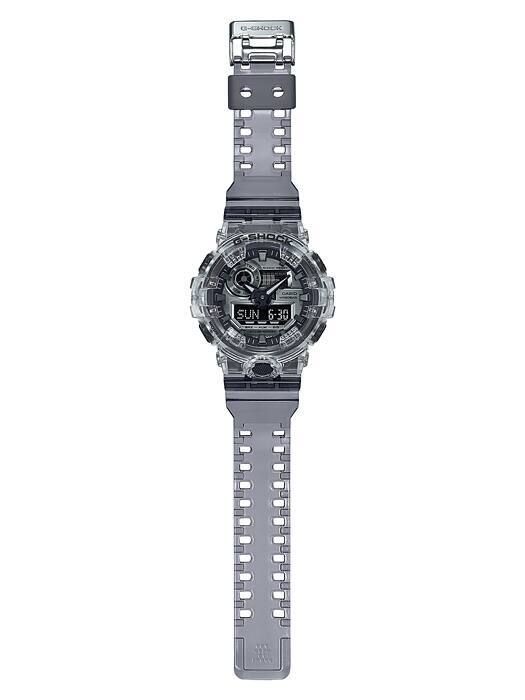 Кварцевые аналого-цифровые наручные часы. Серия Casio G-Shock. Унисекс. Ударопрочная конструкция корпуса защищает механизм часов от ударов и вибрации. 12-ти и 24-х часовой формат отображения времени. Циферблат подсвечивается светодиодом, настройка продолжительности подсветки 1,5 или 3 секунды. Светящееся покрытие стрелок обеспечивает длительное послесвечение в темноте после короткого воздействия света. Секундомер с точностью показаний 1/100 с и временем измерения 24 ч. Режимы измерения: прошедшее время, промежуточное время, два финишных результата; быстрое включение секундомера из режима Текущего времени. Таймер обратного отсчета от 1 мин до 1 ч (с интервалом в 1 минуту). Мировое время - 48 городов (31 часовой пояс), всемирное координированное время (UTC), включение/выключение перехода на летнее время, быстрая замена текущего времени на мировое. 5 ежедневных будильников, один с функцией повтора сигнала; ежечасный сигнал. Включение/выключение звука кнопок. Функция перемещения стрелок для удобного просмотра информации на цифровом экране. Автоматический календарь до 2099 года. Круглый корпус из полупрозрасного полимерного ластика. Размеры корпуса 53.4 мм на 57.5 мм, толщина 18.4 мм. Устойчивое к мелким механическим повреждениям минеральное стекло. Серый полупрозрачный ремешок из полимерног пластика со стандартной застёжкой Buckle. Примерный срок службы батарейки около 5 лет. Водозащищённость 200 WR (плавание и ныряние бкз акваланга). Вес около 69 г.