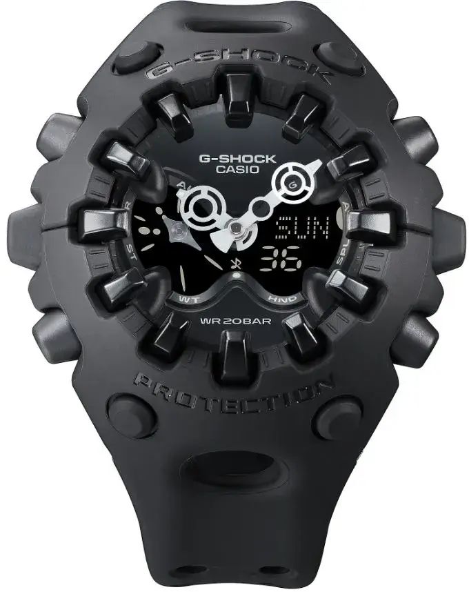 Кварцевые аналого-цифровые наручные часы. Серия G-Shock CoolEyes. Унисекс часы. Новинка отличается смелым дизайном: необычная форма 58-миллиметрового корпуса, дисплей-бабочка (CoolEyes), 3D-часовые метки расположенные снаружи корпуса и интегрированные в рант, устойчивое к ударам сферическое минеральное стекло. Противоударный пластиковый корпус защищает механизм часов от ударов и вибраций. Двойная светодиодная подсветка (циферблата и ЖК-дисплея) с функцией послесвечения, настройка продолжительности подсветки 1,5 или 3 с. Светящееся покрытие стрелок обеспечивает длительное послесвечение в темноте даже после короткого воздействия света. 12-ти и 24-х часовой формат отображения времени. Секундомер с точностью показаний 1/100 с и временем измерения 24 часа. Таймер обратного отсчета от 1 секунды до 24 часов с автоповтором. Мировое время - 31 часовой пояс (48 городов), всемирное координированное время (UTC), включение/отключение летнего времени. 5 ежедневных будильников (один с функцией повтора сигнала Snooze), ежечасный сигнал. Функция перемещения стрелок для удобного просмотра информации на цифровом экране. Функция отключения/включения звука кнопок. Автоматический календарь до 2099 года. Пластиковый корпус чёрного цвета. Размер корпуса 49,1 мм на 58,2мм, толщина 19,6мм. Устойчивое к мелким механическим повреждениям сферическое минеральное стекло. Чёрный пластиковый ремешок со стандартной застёжкой buckle. Батарея рассчитана на 10 лет. Водонепроницаемость 200WR (плавание и ныряние без акваланга). Вес около 74 г.