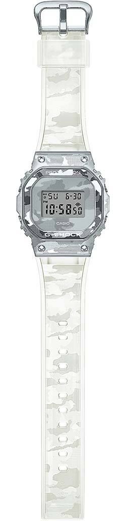 Электронные кварцевые наручные часы. Серия G-Shock. Унисекс. Противоударный корпус защищает механизм часов от ударов и вибрации. Электролюминесцентная подсветка обеспечивает равномерное освещение всего циферблата. Послесвечение. Световая индикация сигнала (LED-индикатор) - лампочка мигает при сигнале будильника, окончании таймера обратного отсчета или секундомера. Многофункциональный будильник, сигнал начала часа. 12-ти и 24-х часовой формат отображения времени. Секундомер с точностью показаний 1/100 секунды (для первых 60 минут) и 1 секунда (после 60 минут) и временем измерения 24 ч. Режимы измерения: прошедшее время, промежуточное время, два финишных результата. Таймер обратного отсчета от 1с до 24ч с автоповтором. Автоматический календарь до 2099 года. Устойчивое к мелким механическим повреждениям минеральное стекло. Восьмиугольный корпус из полимерного пластика. Стальной безель с камуфляжным рисунком, нанесенным лазерной гравировкой. Размеры корпуса 43,2мм на 49,6 мм, толщина 12,9мм. Стальная задняя крышка крепится на 4-х винтах. Полупрозрачный белый пластиковый ремешок в камуфляжной расцветке, нанесенной лазерной гравировкой , стандартная застёжка buckle. Приблизительный срок службы батареи 2 года. Водонепроницаемость 200 WR (плавание и погружение без акваланга). Вес примерно 73 г.