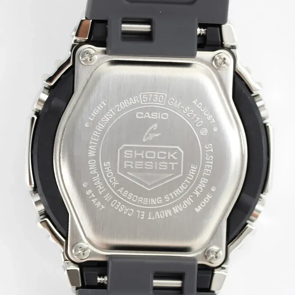 Кварцевые аналого-цифровые наручные часы. Серия G-Shock. Унисекс. Противоударный корпус из нержавеющей стали и полимерного пластика защищает механизм часов от ударов и вибраций. Двойная светодиодная подсветка обеспечивает подсветку не только цифрового дисплея, но и аналогового циферблата. Настройка продолжительности подсветки 1,5 или 3 секунды, послесвечение. Светящееся покрытие стрелок обеспечивает длительное послесвечение в темноте после непродолжительного воздействия света. Зелёный циферблат с часовыми метками в виде штрихов. 12-ти и 24-х часовой формат отображения времени. Секундомер с точностью показаний 1/100 с (первый час) и 1 с (после первого часа) и временем измерения 24 часа. Режимы измерения: прошедшее время, промежуточное время, два финишных результата. Таймер обратного отсчета от 1 секунды до 24 часов (с интервалом в 1 секунду) с автоповтором. Мировое время - 31 часовой пояс (48 городов), всемирное координированное время (UTC), включение/отключение летнего времени. 5 ежедневных будильников, ежечасный сигнал. Функция перемещения стрелок для удобного просмотра информации на цифровом экране. Функция отключения/включения звука кнопок. Автоматический календарь до 2099 года. Восьмиугольный корпус серебристого цвета из нержавеющей стали и полимерного пластика. Размер корпуса 40,5 мм на 45,9мм, толщина 11мм. Устойчивое к мелким механическим повреждениям минеральное стекло. Cthsq hемешок из биопластика (изготавливается из возобновляемых органических ресурсов), классическая застежка buckle. Примерный срок службы батареи 3 года. Водонепроницаемость 200WR (плавание и ныряние без акваланга). Вес около 56 г.