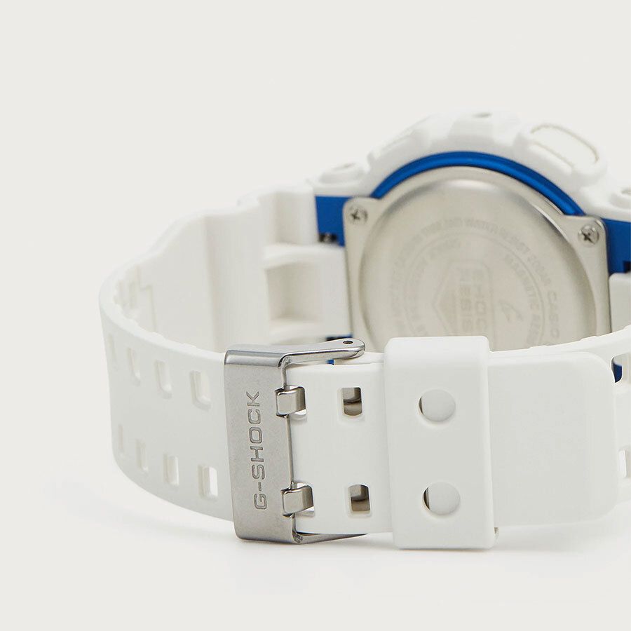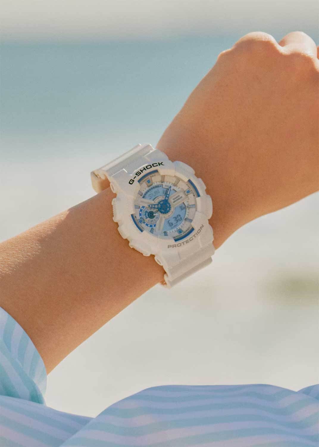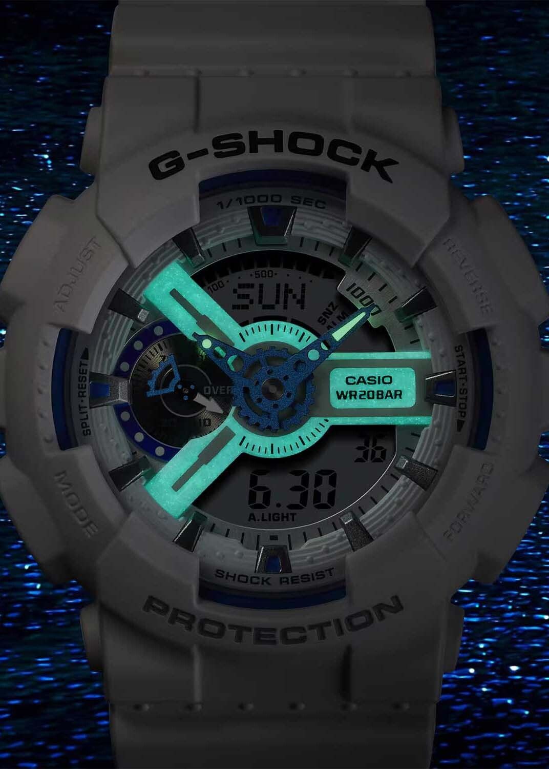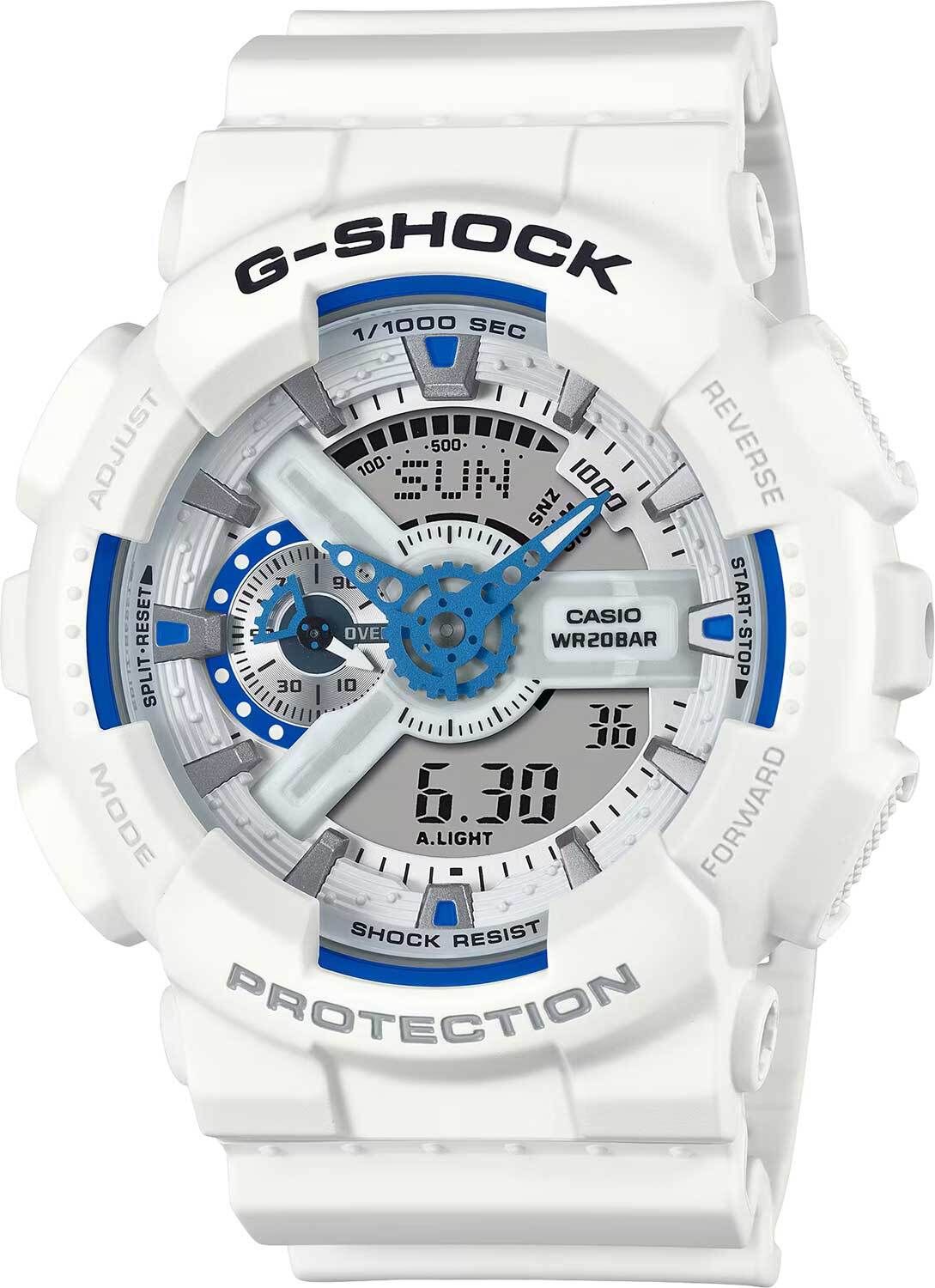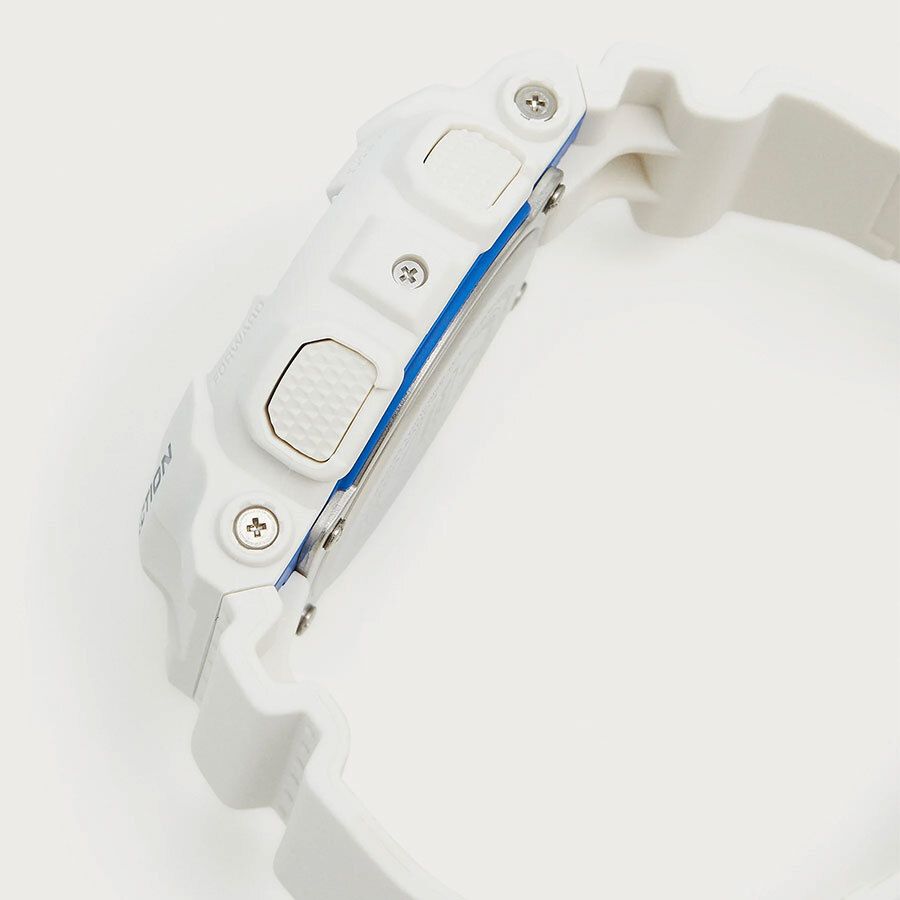 Кварцевые часы c аналого-цифровым отображением времени. Серия G-Shock. Унисекс часы. Подсветка циферблата вдохновлена сиянием биолюминесцентного планктона, плавающего в море. Противоударный корпус защищает механизм часов от ударов и вибрации. Часы созданы с защитой от магнитных полей. Светодиодная автоподсветка - поворот руки при недостаточном освещении обеспечит автоматическое включение подсветки циферблата. Выбор продолжительности подсветки 1,5 или 3 секунды, послесвечение. Светонакопительное покрытие циферблата и стрелок обеспечивает длительное послесвечение в темноте после кратковременного воздействия света. Секундомер с точностью показаний 1/1000 секунды и временем измерения 100 ч. Режимы измерения: прошедшее время, промежуточное время, время круга. Таймер обратного отсчета от 1 минуты до 24 часов (с интервалом в 1 минуту и с интервалом в 1 час) с автоповтором. 12-ти и 24-х часовой формат отображения времени. Расчет скорости по выбранной дистанции. 5 ежедневных будильников (1 с функцией повтора сигнала), почасовой сигнал времени. Мировое время – 48 городов (29 часовых поясов), всемирное координированное время (UTC), включение/отключение летнего времени, переключение между домашним и мировым временем. Автоматический календарь до 2099 г. Круглый корпус из полимерного пластика белого цвета. Размер корпуса 51,2 мм на 55 мм, толщина 16,9 мм. Белый пластиковый ремешок с классической застежкой buckle. Минеральное стекло устойчивое к мелким механическим повреждениям. Батарейка рассчитана на 2 года. Водонепроницаемость WR200 (плавание и ныряние без акваланга). Вес около 72 г.