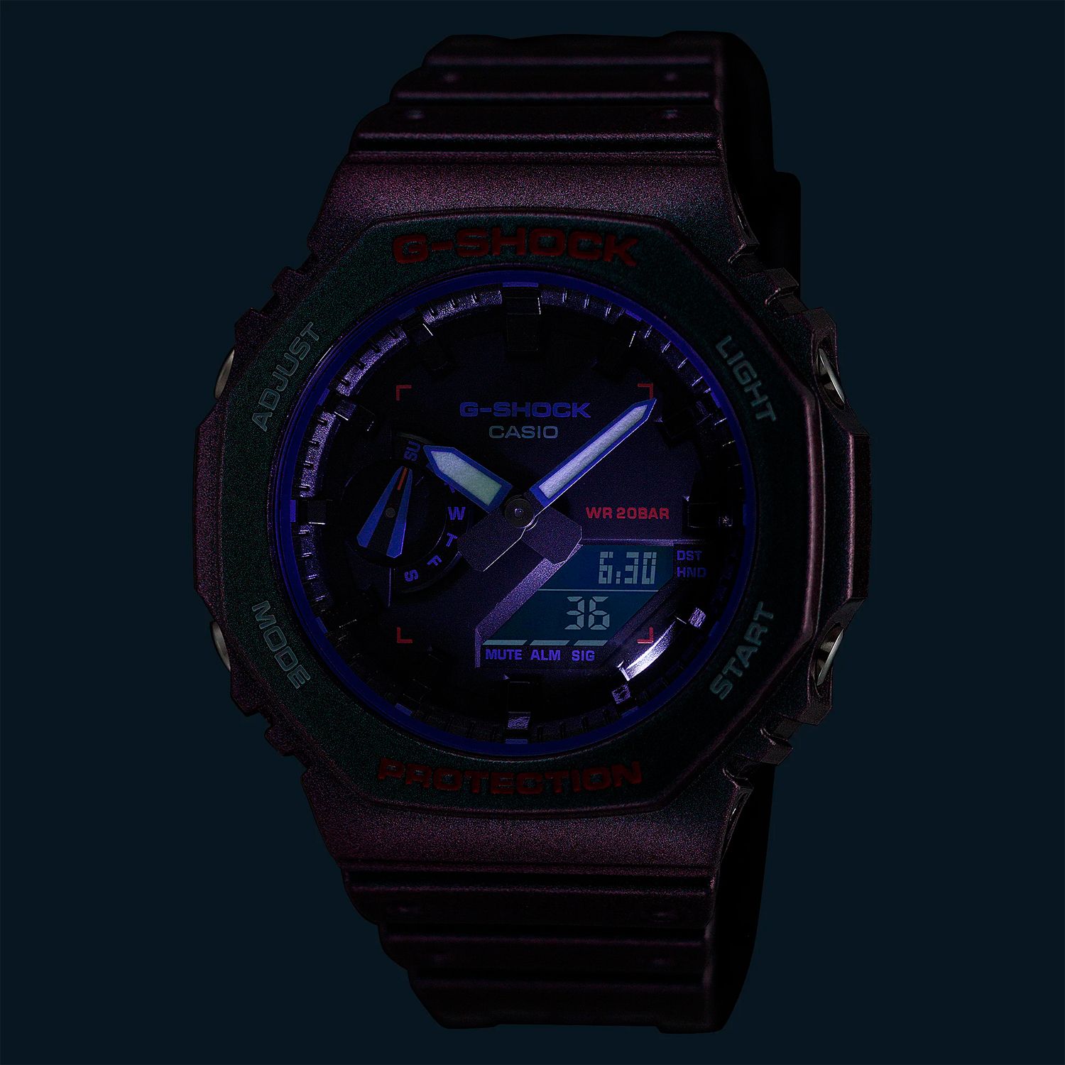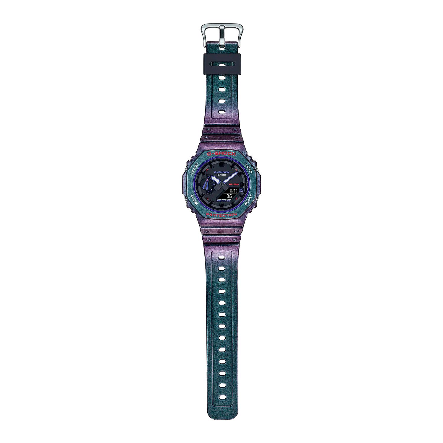 Кварцевые аналогово-цифровые наручные часы. Унисекс. Серия G-Shock Carbon Core Guard. Противоударный пластиковый корпус с углеродными волокнами (структура Core Guard) более прочный и в то же время более легкий, защищает механизм часов от ударов и вибраций. Двойная светодиодная подсветка обеспечивает подсветку не только цифрового дисплея, но и аналогового циферблата. Настройка продолжительности подсветки 1,5 или 3 секунды, послесвечение. Светящееся покрытие обеспечивает длительную подсветку в темное время суток после короткого воздействия света. 12-ти и 24-х часовой формат отображения времени. Секундомер с точностью показаний 1/100 с (первый час) и 1 с (после первого часа) и временем измерения 24 часа. Режимы измерения: прошедшее время, промежуточное время, два финишных результата. Таймер обратного отсчета отот 1 секунды до 24 часов (с интервалом в 1 секунду) с автоповтором. Мировое время - 31 часовой пояс (48 городов), всемирное координированное время (UTC), включение/отключение летнего времени. 5 ежедневных будильников, ежечасный сигнал. Функция перемещения стрелок. Функция отключения/включения звука кнопок. Автоматический календарь до 2099 года. Усиленный углеродными волокнами пластиковый восьмиугольный корпус. Размеры корпуса 48,4 мм х 45,4 мм, толщина 11,8 мм. Устойчивое к мелким механическим повреждениям минеральное стекло. Пластиковый ремешок со стандартной застёжкой Buckle. Ремешок и корпус цвета «хамелеон» - фиолетового или зеленого цветов, в зависимости от угла обзора. Водонепроницаемость 200WR (плавание и ныряние без акваланга). Примерный срок службы батареи 3 года. Вес около 51 г.