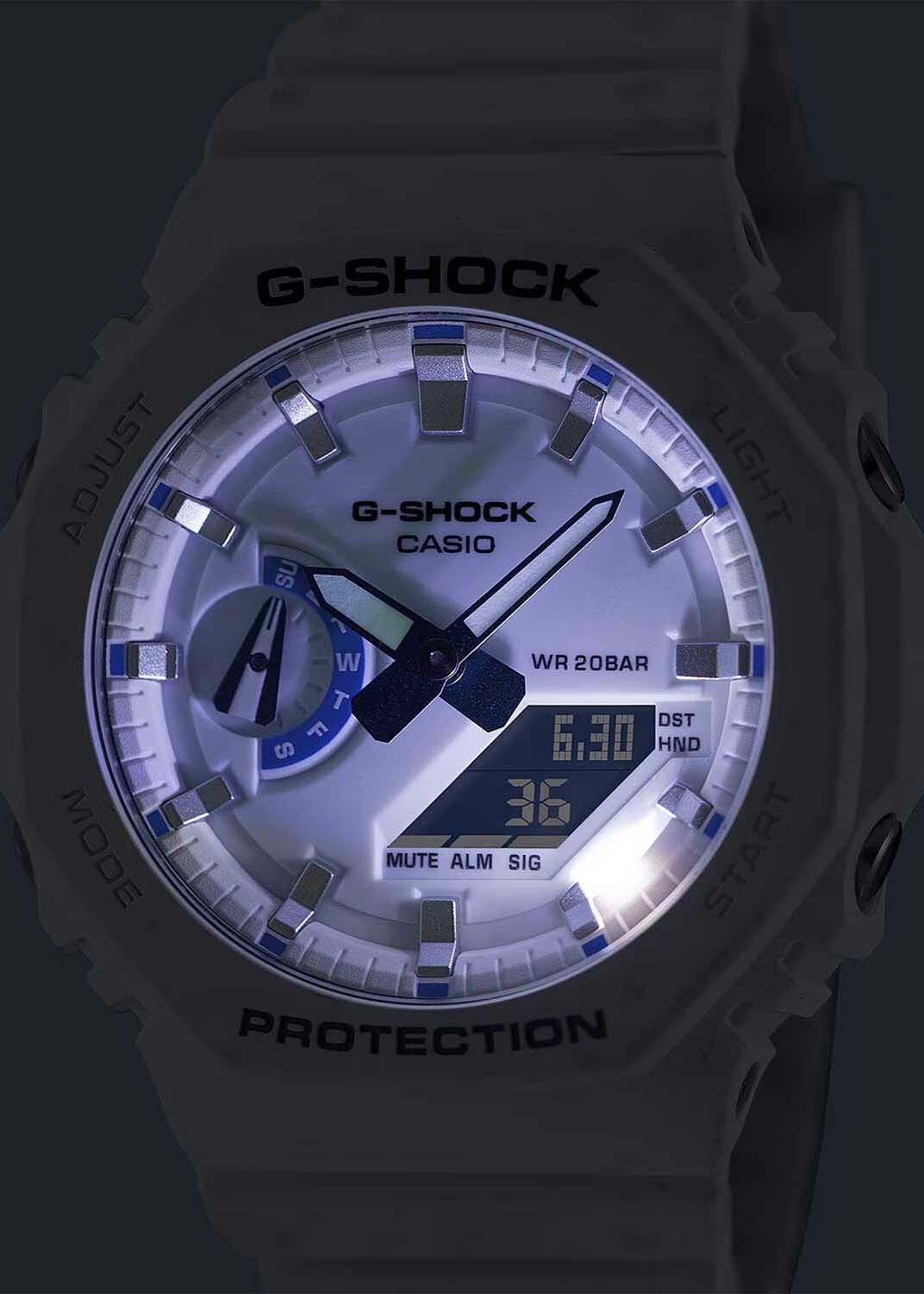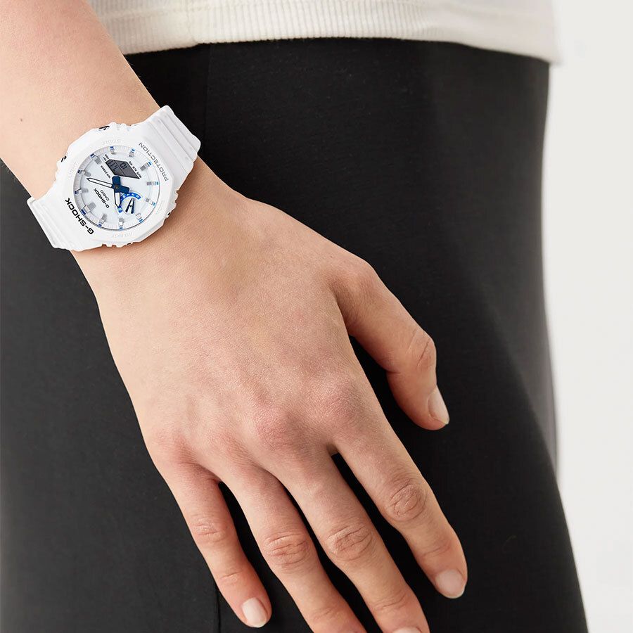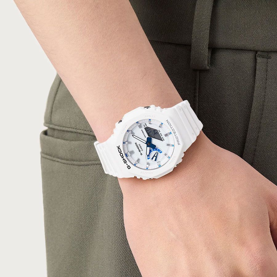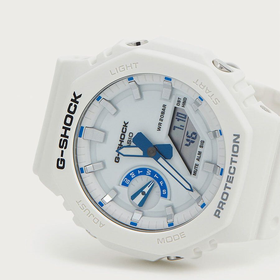 Кварцевые часы c аналого-цифровым отображением времени. Серия G-Shock. Унисекс часы. Противоударный корпус из биопластика (изготавливается из возобновляемых органических ресурсов) с углеродными волокнами (структура Carbon Core Guard) более прочный и в то же время более легкий, защищает механизм часов от ударов и вибраций. Двойная светодиодная подсветка обеспечивает подсветку не только цифрового дисплея, но и аналогового циферблата. Настройка продолжительности подсветки 1,5 или 3 секунды, послесвечение. Светящееся покрытие стрелок обеспечивает длительное послесвечение в темноте после кратковременного воздействия света. Циферблат полностью или частично изготовлен из пластика, пропитанного фосфоресцирующим материалом, обеспечивающим зеленое свечение в темноте. 12-ти и 24-х часовой формат отображения времени. Ретроградный стрелочный указатель для недели. Секундомер с точностью показаний 1/100 с (первый час) и 1 с (после первого часа) и временем измерения 24 часа. Режимы измерения: прошедшее время, промежуточное время, два финишных результата. Таймер обратного отсчета от 1 секунды до 24 часов (с интервалом в 1 секунду) с автоповтором. Мировое время - 31 часовой пояс (48 городов), всемирное координированное время (UTC), включение/отключение летнего времени. 5 ежедневных будильников, ежечасный сигнал. Функция перемещения стрелок. Функция отключения/включения звука кнопок. Автоматический календарь до 2099 года. Усиленный углеродными волокнами восьмиугольный корпус из биопластика (изготавливается из возобновляемых органических ресурсов) белого цвета. Размеры корпуса 48,5 мм на 45,4 мм, толщина 11,8 мм. Устойчивое к мелким механическим повреждениям минеральное стекло. Белый ремешок из биоплавтика (изготавливается из возобновляемых органических ресурсов) со стандартной застёжкой buckle. Водонепроницаемость 200WR (плавание и ныряние без акваланга). Батарейка рассчитана на 3 года. Вес около 51 г.