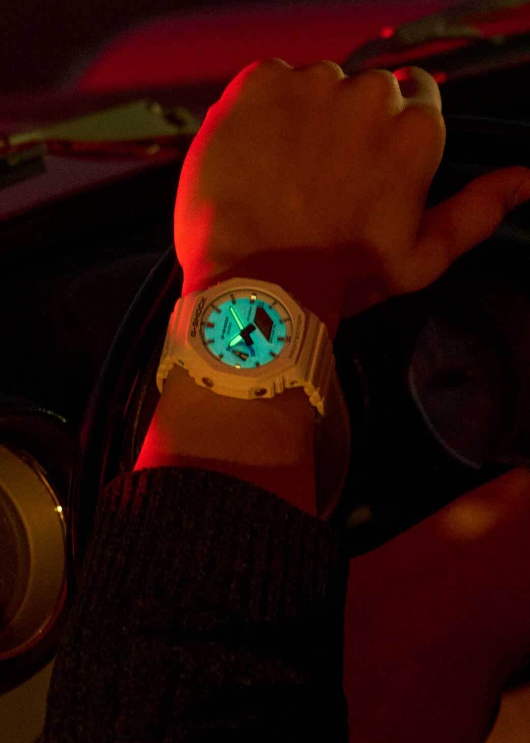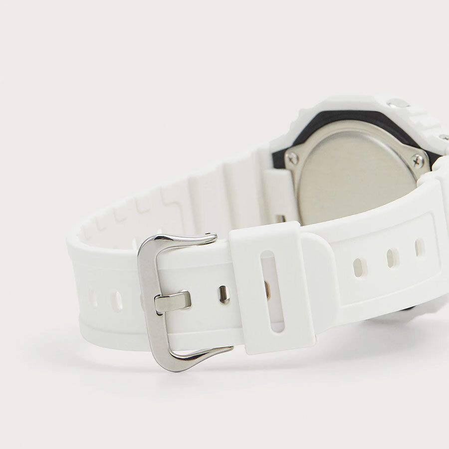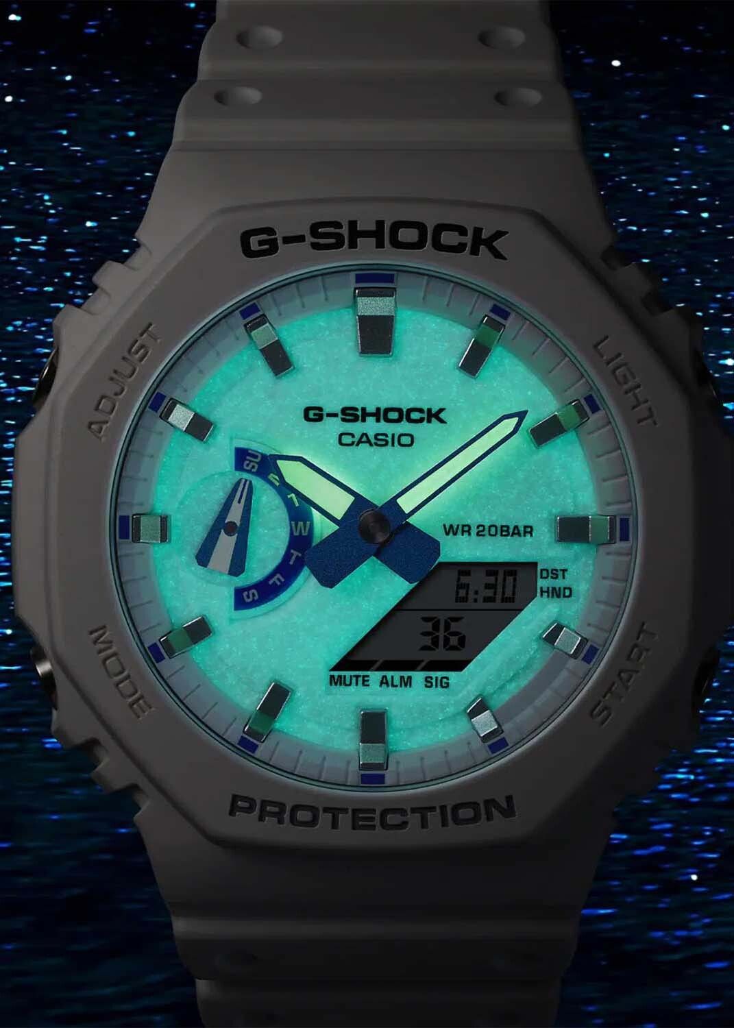 Кварцевые часы c аналого-цифровым отображением времени. Серия G-Shock. Унисекс часы. Противоударный корпус из биопластика (изготавливается из возобновляемых органических ресурсов) с углеродными волокнами (структура Carbon Core Guard) более прочный и в то же время более легкий, защищает механизм часов от ударов и вибраций. Двойная светодиодная подсветка обеспечивает подсветку не только цифрового дисплея, но и аналогового циферблата. Настройка продолжительности подсветки 1,5 или 3 секунды, послесвечение. Светящееся покрытие стрелок обеспечивает длительное послесвечение в темноте после кратковременного воздействия света. Циферблат полностью или частично изготовлен из пластика, пропитанного фосфоресцирующим материалом, обеспечивающим зеленое свечение в темноте. 12-ти и 24-х часовой формат отображения времени. Ретроградный стрелочный указатель для недели. Секундомер с точностью показаний 1/100 с (первый час) и 1 с (после первого часа) и временем измерения 24 часа. Режимы измерения: прошедшее время, промежуточное время, два финишных результата. Таймер обратного отсчета от 1 секунды до 24 часов (с интервалом в 1 секунду) с автоповтором. Мировое время - 31 часовой пояс (48 городов), всемирное координированное время (UTC), включение/отключение летнего времени. 5 ежедневных будильников, ежечасный сигнал. Функция перемещения стрелок. Функция отключения/включения звука кнопок. Автоматический календарь до 2099 года. Усиленный углеродными волокнами восьмиугольный корпус из биопластика (изготавливается из возобновляемых органических ресурсов) белого цвета. Размеры корпуса 48,5 мм на 45,4 мм, толщина 11,8 мм. Устойчивое к мелким механическим повреждениям минеральное стекло. Белый ремешок из биоплавтика (изготавливается из возобновляемых органических ресурсов) со стандартной застёжкой buckle. Водонепроницаемость 200WR (плавание и ныряние без акваланга). Батарейка рассчитана на 3 года. Вес около 51 г.
