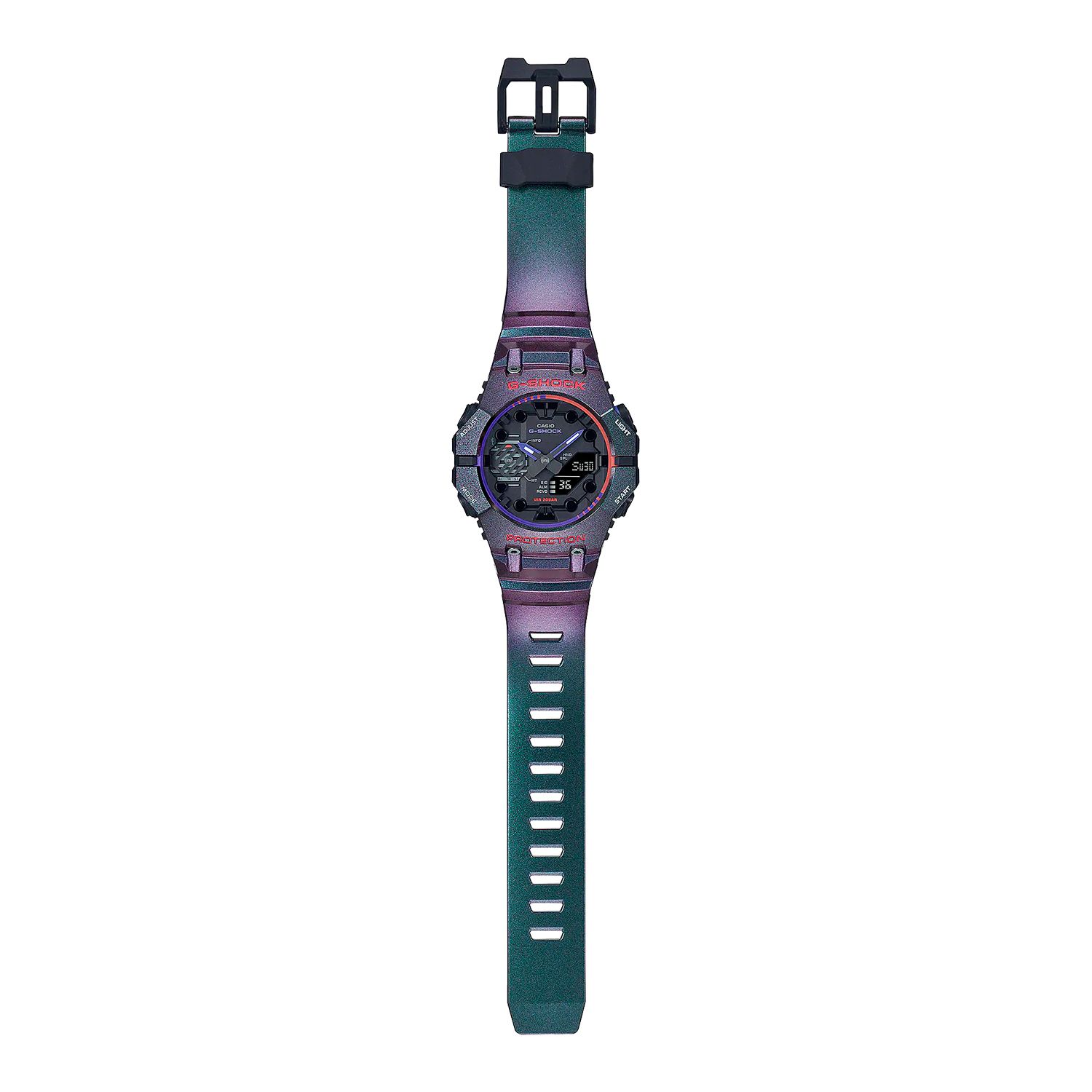 Кварцевые аналогово-цифровые наручные часы. Унисекс. Серия Casio G-Shock. Модель отличается уникальной конструкцией с двумя отдельными безелями, которые соединяются в положениях «9 часов» и «3 часа». Противоударный пластиковый корпус, усиленный углеродными волокнами (структура Carbon Core Guard), защищает внутренний модуль часов от повреждений и деформаций при ударах. Двойная светодиодная подсветка: подсвечивается не только циферблат часов, но и цифровой дисплей, настройка продолжительности подсветки 1,5 с или 3 с, послесвечение. 12-ти и 24-х часовой формат отображения времени. Секундомер с точностью измерения 1/100 секунды (в течение первого часа), 1 секунда (через 1 час) и временем измерения 24 часа. Режимы измерения: прошедшее время, время прохождения части дистанции, время первых двух финишей. Таймер обратного отсчета от 1 секунды до 24 часов (с интервалом в 1 секунду, с интервалом в 1 минуту и с интервалом в 1 час). Мировое время – 38 городов (38 часовых поясов), всемирное координированное время (UTC), включения/отключения летнего времени, быстрая замена текущего времени на мировое. 5 ежедневных будильников, сигнал начала часа. Часы оснащены беспроводной технология Bluetooth® со сверхнизким потреблением энергии для синхронизации со смартфоном. При подключении к смартфону часы автоматически корректируют текущее время и получают доступ к целому ряду полезных функций. Автоматический календарь до 2099 года. Функции поиска телефона. Включение/выключение звука кнопок. Функция перемещения стрелок. Отображение дней недели на шести языках. Усиленный углеродными волокнами пластиковый корпус. Размеры корпуса 42,5 мм х 46 мм, толщина 13,8 мм. Устойчивое к мелким механическим повреждениям минеральное стекло. Пластиковый ремешок со стандартной застёжкой Buckle. Ремешок и корпус цвета «хамелеон» -фиолетового или зеленого, в зависимости от угла обзора. Примерный срок службы батареек около 2 лет. Водонепроницаемость 200WR (плавание и ныряние без акваланга). Вес около 51 г.
