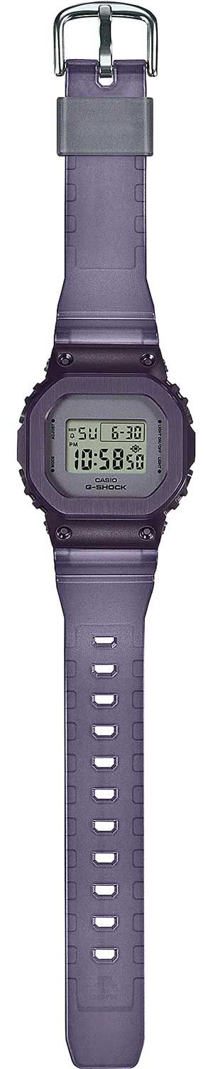 Кварцевые электронные наручные часы. Унисекс. Серия G-Shock. Противоударный корпус защищает механизм часов от ударов и вибрации. Электролюминесцентная подсветка освещает весь циферблат, послесвечение. LED-индикатор (световая индикация сигнала) - лампочка начинает мигать при сигнале будильника, окончании таймера обратного отсчета или секундомера. Многофункциональный будильник - ежедневный сигнал, ежемесячный сигнал, сигнал каждый день определенного месяца, на определенную дату, сигнал начала каждого часа. 12-ти и 24-х часовой формат отображения времени. Секундомер с точностью показаний 1/100с (для первых 60 минут) и 1с (после 1ч) и временем измерения 24ч. Режимы измерения: отдельные отрезки времени, промежуточное время, два финишных результата. Таймер обратного отсчета от 1 с до 24 ч с автоповтором. Автоматический календарь до 2099 года. Устойчивое к мелким механическим повреждениям минеральное стекло. Восьмиугольный корпус из нержавеющей стали с покрытием фиолетового цвета и полимерного пластика. Размеры корпуса 43,8 мм на 38,4мм, толщина 10,9мм. Стальная задняя крышка крепится на 4-х винтах. Фиолетовый ремешок из полимерного пластика, стандартная застёжка buckle. Приблизительный срок службы батареи 2 года. Водонепроницаемость 200 WR (плавание и погружение без акваланга). Вес примерно 50 г.