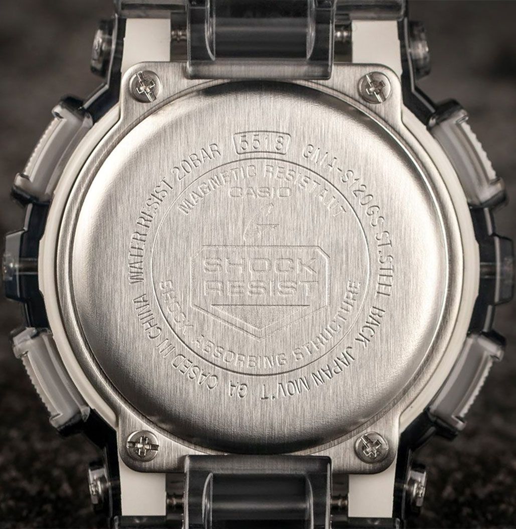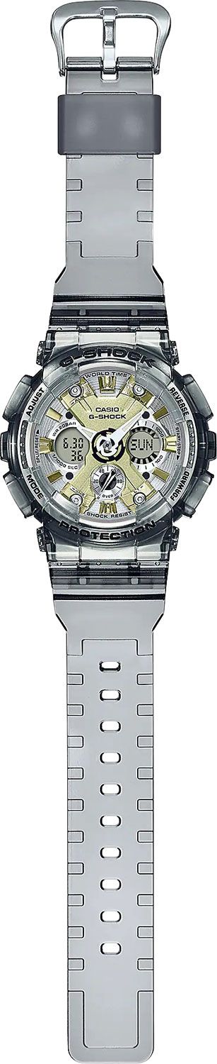 Кварцевые наручные часы c аналого-цифровым отображением времени. Серия Casio G-Shock S-series. Унисекс. Противоударный корпус защищает механизм часов от ударов и вибрации. Часы созданы с защитой от магнитных полей. Автоматическая светодиодная подсветка — при недостаточном освещении поворот руки включает подсветку циферблата, выбор продолжительности подсветки 1,5 секунды или 3 секунды, послесвечение. Стрелки с люминесцентным покрытием, которое светится в темноте после непродолжительного воздействия света. Мировое время – 48 городов (29 часовых поясов), всемирное координированное время (UTC), включение/отключение летнего времени, переключение между домашним и мировым временем. 12-ти и 24-х часовой формат отображения времени. Секундомер с точностью показаний 1/1000 с и временем измерения 100 ч. Режимы измерения: пройденное время, время круга, промежуточное время. Расчет скорости по выбранной дистанции. Таймер обратного отсчета от 1 мин до 24 ч (с интервалом в 1 минуту и с интервалом в 1 час) с автоповтором. 5 ежедневных будильников, один с функцией повтора сигнала (Snooze), ежечасный сигнал. Автоматический календарь до 2099 года. Круглый корпус из полупрозрачного пластика серого цвета. Размер корпуса 45,9 мм на 49мм, толщина 15,8мм. Устойчивое к мелким механическим повреждениям минеральное стекло. Полупрозрачный пластиковый ремешок серого цвета с классической застежкой Buckle. Приблизительный срок службы батареи 3 года. Водонепроницаемость 200 WR (плавание и ныряние без акваланга). Вес около 55 г.