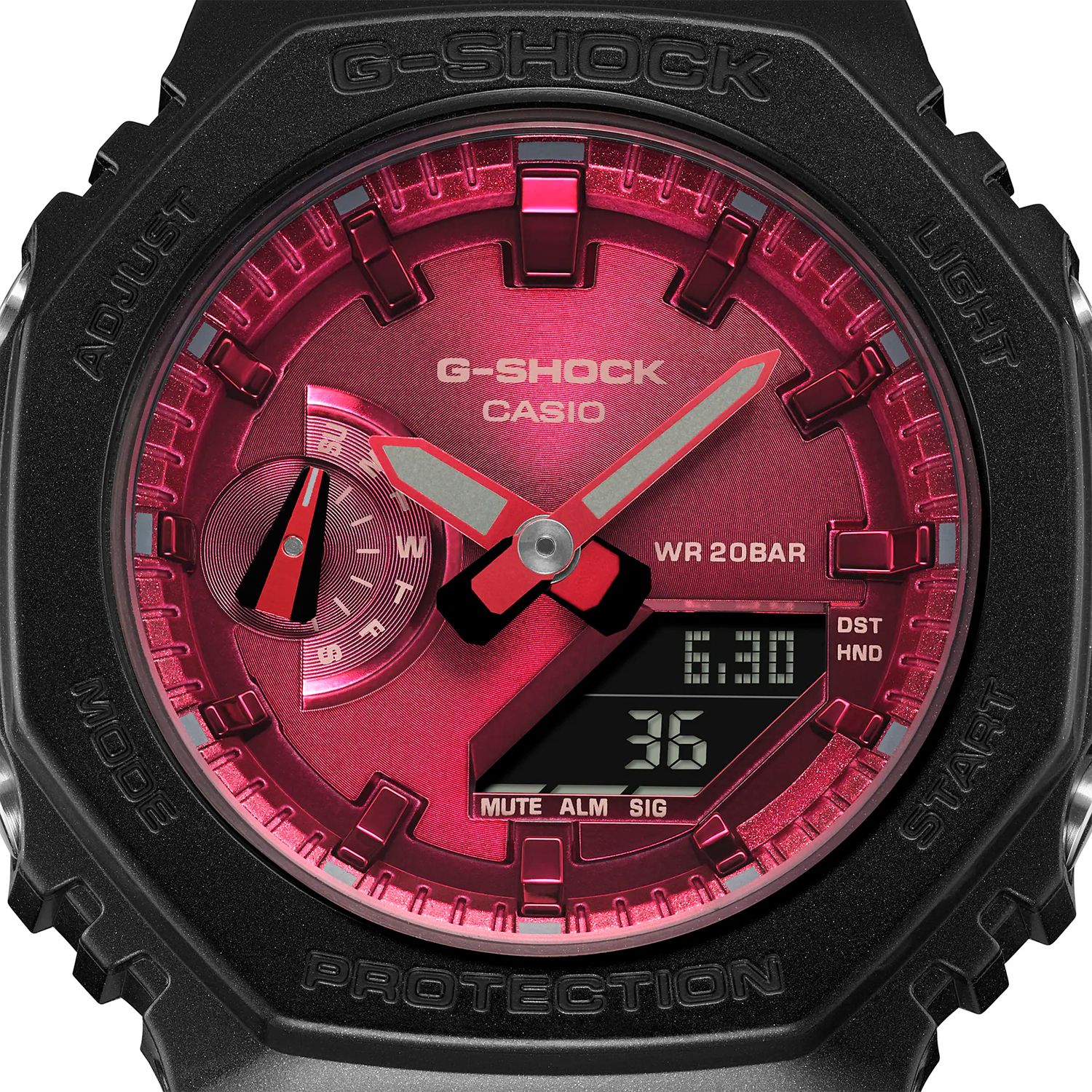 Кварцевые аналогово-цифровые наручные часы. Унисекс. Серия G-Shock Carbon Core Guard. Противоударный пластиковый корпус с углеродными волокнами (структура Core Guard) более прочный и в то же время более легкий, защищает механизм часов от ударов и вибраций. Двойная светодиодная подсветка обеспечивает подсветку не только цифрового дисплея, но и аналогового циферблата. Настройка продолжительности подсветки 1,5 или 3 секунды, послесвечение. Светящееся покрытие обеспечивает длительную подсветку в темное время суток после короткого воздействия света. 12-ти и 24-х часовой формат отображения времени. Секундомер с точностью показаний 1/100 с (первый час) и 1 с (после первого часа) и временем измерения 24 часа. Режимы измерения: прошедшее время, промежуточное время, два финишных результата. Таймер обратного отсчета от 1 секунды до 24 часов (с интервалом в 1 секунду) с автоповтором. Мировое время - 31 часовой пояс (48 городов), всемирное координированное время (UTC), включение/отключение летнего времени. 5 ежедневных будильников, ежечасный сигнал. Функция перемещения стрелок. Функция отключения/включения звука кнопок. Автоматический календарь до 2099 года. Усиленный углеродными волокнами пластиковый восьмиугольный корпус чёрного цвета. Устойчивое к мелким механическим повреждениям минеральное стекло. Пластиковый чёрный ремешок со стандартной застёжкой Buckle. Водонепроницаемость 200WR (плавание и ныряние без акваланга). Примерный срок службы батареи 3 года. Вес около 41 г.