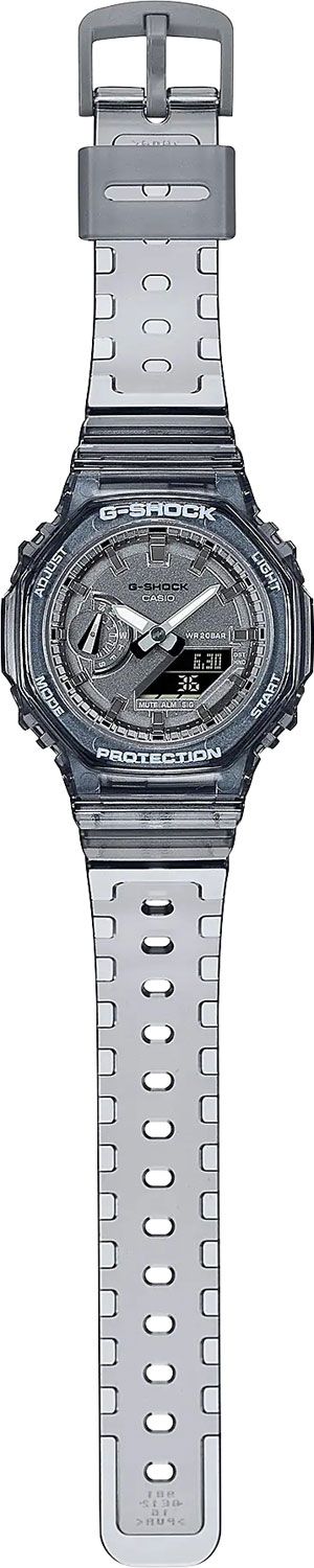 Кварцевые аналогово-цифровые наручные часы. Серия G-Shock Carbon Core Guard. Унисекс. Противоударный пластиковый корпус с углеродными волокнами (структура Carbon Core Guard) более прочный и в то же время более легкий, защищает механизм часов от ударов и вибраций. Двойная светодиодная подсветка обеспечивает подсветку не только цифрового дисплея, но и аналогового циферблата. Настройка продолжительности подсветки 1,5 или 3 секунды, послесвечение. Светящееся покрытие стрелок обеспечивает длительное послесвечение в темное время суток после короткого воздействия света. 12-ти и 24-х часовой формат отображения времени. Ретроградный стрелочный указатель дня недели находится в позиции 9 ч. Секундомер с точностью показаний 1/100 с (первый час) и 1 с (после первого часа) и временем измерения 24 часа. Режимы измерения: прошедшее время, промежуточное время, два финишных результата. Таймер обратного отсчета от 1 секунды до 24 часов (с интервалом в 1 секунду) с автоповтором. Мировое время - 31 часовой пояс (48 городов), всемирное координированное время (UTC), включение/отключение летнего времени. 5 ежедневных будильников, ежечасный сигнал. Функция перемещения стрелок для удобного просмотра информации на цифровом экране. Функция отключения/включения звука кнопок. Автоматический календарь до 2099 года. Усиленный углеродными волокнами полупрозрачный пластиковый восьмиугольный корпус серого цвета. Размеры корпуса 42,9 мм на 46,2мм, толщина 11,2мм. Устойчивое к мелким механическим повреждениям минеральное стекло. Полупрозрачный пластиковый серый ремешок со стандартной застёжкой Buckle. Примерный срок службы батареек 3 года. Водонепроницаемость 200WR (плавание и ныряние без акваланга). Вес около 41 г.