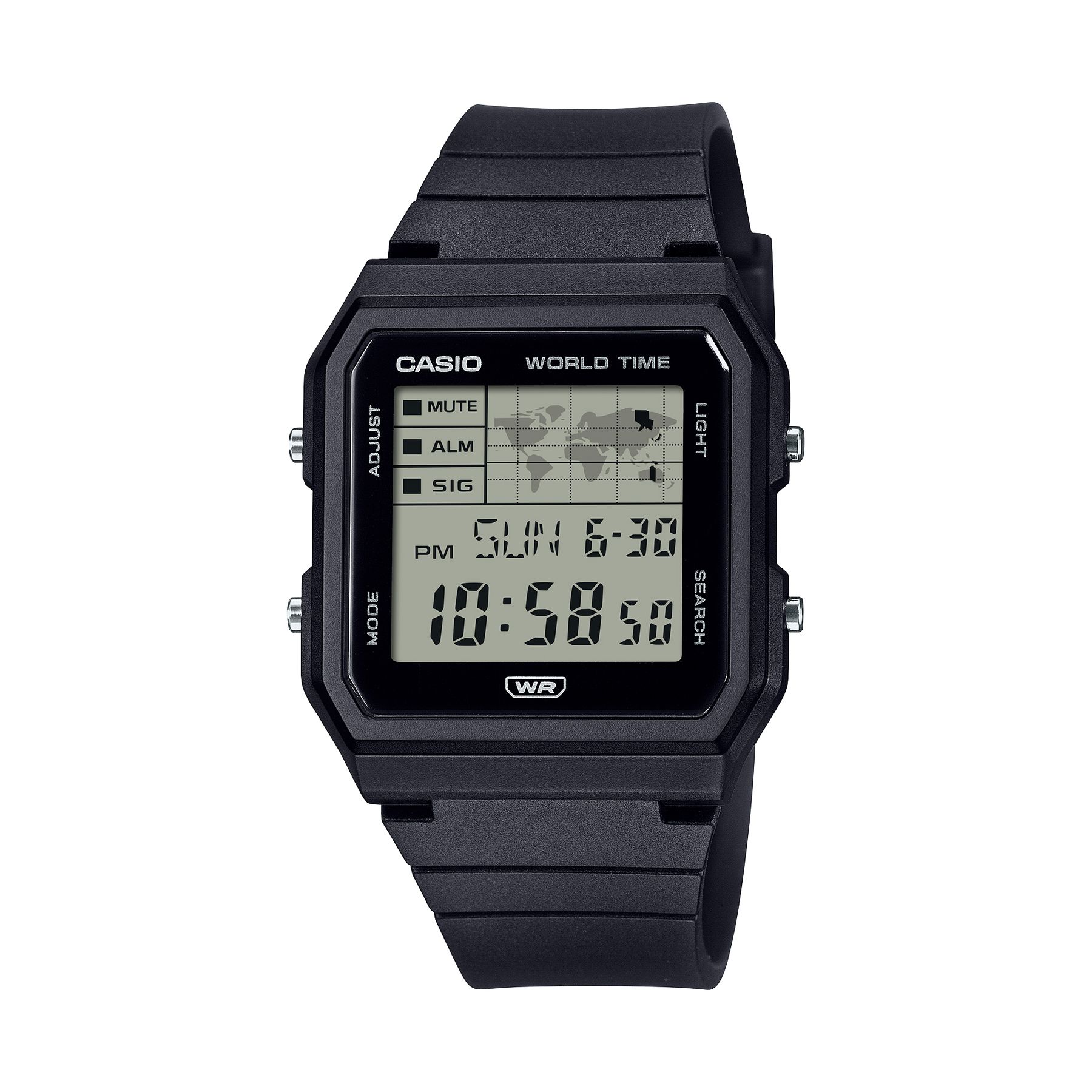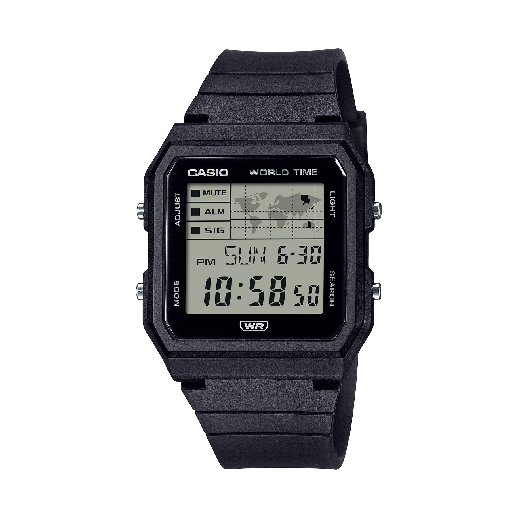 Кварцевые наручные часы c цифровым отображением времени. Коллекция Vintage Digital. Унисекс часы. В правом верхнем углу дисплея расположена карта мира, синхронизированная с текущим временем внизу экрана, позволяя всегда ориентироваться в своем местоположении во время путешествий. Серый ЖК дисплей. Светодиодная подсветка дисплея, выбираемая продолжительность подсветки 1,5 секунды или 3 секунды, послесвечение. Мировое время – 48 городов (31 часовой пояс), всемирное координированное время (UTC), функция включения/отключения летнего времени, переключение между домашним и мировым временем. Функция Мульти Тайм: одновременное отображение времени в 4 городах. Секундомер с точностью показаний 1/100 секунды и временем измерения 24 часа. Режимы измерения: прошедшее время, промежуточное время, два финишных результата. Таймер обратного отсчета от 1секунды до 24часов. 5 ежедневных будильников, ежечасный сигнал. Автоматический календарь до 2099 года. Функция включения/выключения звука кнопок. 12-ти и 24-х часовой формат отображения времени. Прямоугольный корпус из биопластика (изготавливается из возобновляемых органических ресурсов) чёрного цвета. Размер корпуса 37,8 мм на 33,7мм, толщина 8,6 мм. Пластиковое стекло. Черный ремешок из биопластика (изготавливается из возобновляемых органических ресурсов) со стандартной застежкой buckle. Батарея рассчитана на 3 года. Водонепроницаемость WR30 (защита от брызг). Вес около 23 г.