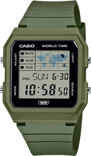Кварцевые наручные часы c цифровым отображением времени. Коллекция Vintage Digital. Унисекс часы. В правом верхнем углу дисплея расположена карта мира, синхронизированная с текущим временем внизу экрана, позволяя всегда ориентироваться в своем местоположении во время путешествий. Серый ЖК дисплей. Светодиодная подсветка дисплея, выбираемая продолжительность подсветки 1,5 секунды или 3 секунды, послесвечение. Мировое время – 48 городов (31 часовой пояс), всемирное координированное время (UTC), функция включения/отключения летнего времени, переключение между домашним и мировым временем. Функция Мульти Тайм: одновременное отображение времени в 4 городах. Секундомер с точностью показаний 1/100 секунды и временем измерения 24 часа. Режимы измерения: прошедшее время, промежуточное время, два финишных результата. Таймер обратного отсчета от 1секунды до 24часов. 5 ежедневных будильников, ежечасный сигнал. Автоматический календарь до 2099 года. Функция включения/выключения звука кнопок. 12-ти и 24-х часовой формат отображения времени. Прямоугольный корпус из биопластика (изготавливается из возобновляемых органических ресурсов) зелёного цвета. Размер корпуса 37,8 мм на 33,7мм, толщина 8,6 мм. Пластиковое стекло. Зелёный ремешок из биопластика (изготавливается из возобновляемых органических ресурсов) со стандартной застежкой buckle. Батарея рассчитана на 3 года. Водонепроницаемость WR30 (защита от брызг). Вес около 23 г.
