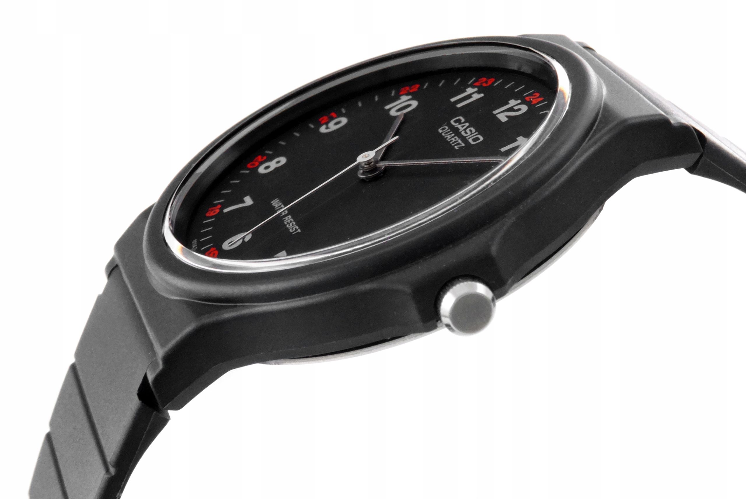 Кварцевые часы с аналоговым отображение времени. Серия Casio Collection. Унисекс часы. Центральные часовая, минутная и секундная стрелки. Чёрный циферблат с часовыми метками в виде арабских цифр. Минутная шкала на циферблате. Пластиковое стекло. Круглый корпус из полимерного пластика чёрного цвета. Размер корпуса 38,8 мм на 33,8 мм, толщина 7,8 мм. Рифлёная переводная головка с защитой. Чёрный пластиковый ремешок с классической застёжкой buckle. Батарейка рассчитана на 2 года. Водонепроницаемость 30WR (защита от брызг). Вес около 20 г.