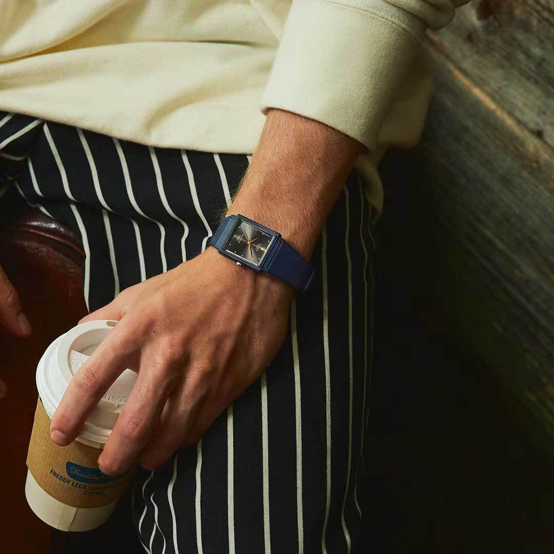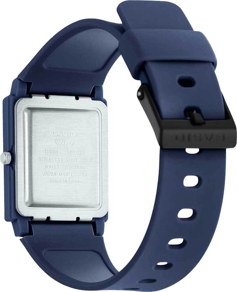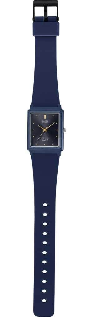 Кварцевые наручные часы с аналоговым отображением времени. Серия Casio Collection. Унисекс часы. Центральные часовая, минутная и секундная стрелки золотистого цвета. Чёрный циферблат с часовыми метками в виде точек. Пластиковое стекло. Прямоугольный пластиковый корпус синего цвета. Размеры корпуса 37.2 мм на 26.5 мм, толщина 8,1 мм. Рифлёная переводная головка. Синий пластиковый ремешок с классической застёжкой buckle. Стальная задняя крышка. Батарейка рассчитана на 3 года. Водонепроницаемость 30WR (защита от брызг). Вес около 19 г.