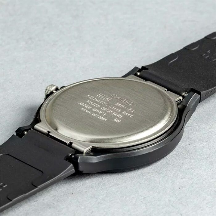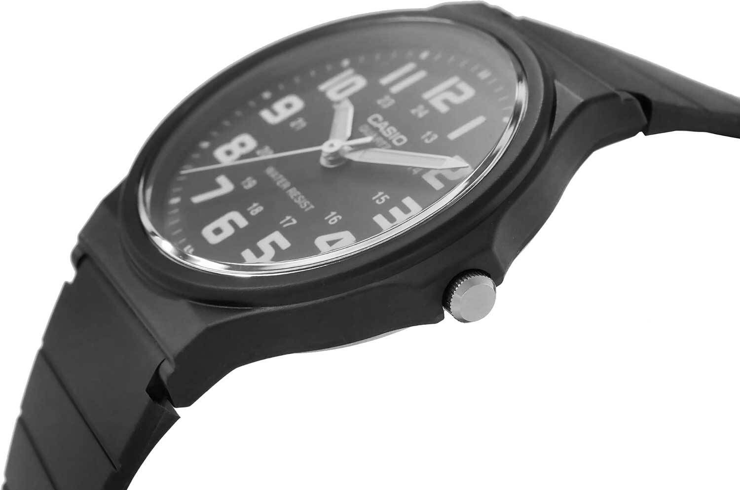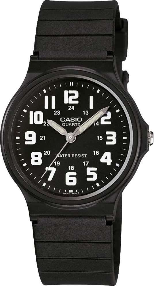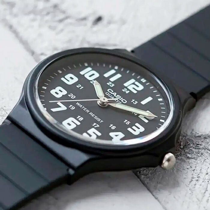 Кварцевые часы с аналоговым отображением времени. Серия Casio Collection. Унисекс часы. Центральные часовая, минутная и секундная стрелки. Чёрный циферблат с часовыми метками в виде арабских цифр. Стрелки с люминесцентным покрытием, которое светится в темноте после непродолжительного воздействия света. 12-ти и 24-х часовой формат отображения времени. Пластиковое стекло. Круглый корпус из полимерного пластика чёрного цвета. Размер корпуса 38,8 мм на 34,9 мм, толщина 7,8 мм. Переводная головка с защитой. Чёрный пластиковый ремешок с классической застёжкой buckle. Батарейка рассчитана на 3 года. Водонепроницаемость 30WR (защита от брызг). Вес около 20 г.