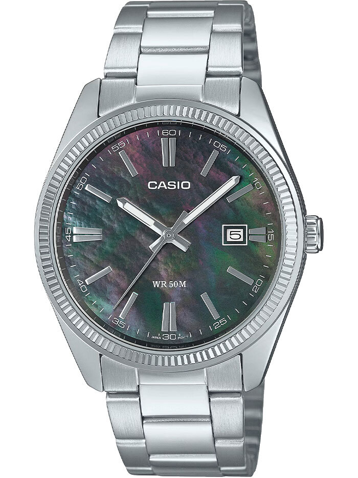 Кварцевые часы с аналоговым отображением времени. Серия General Collection. Унисекс часы. Центральные часовая, минутная и секундная стрелки. Чёрный перламутровый циферблат с часовыми метками в виде штрихов. Стрелки с люминесцентным покрытием, которое светится в темноте после непродолжительного воздействия света. Окошко даты в позиции 3 часов. Минутная шкала на циферблате. Устойчивое к мелким механическим повреждениям минеральное стекло. Круглый корпус из нержавеющей стали. Размеры корпуса 44,2 мм на 38,5 мм, толщина 9,4 мм. Рифлёный безель. Стальной браслет с тройной раскладывающейся застежкой. Батарейка рассчитана на 3 года. Водонепроницаемость 50WR (мытьё рук, дождь). Вес около 104 г.