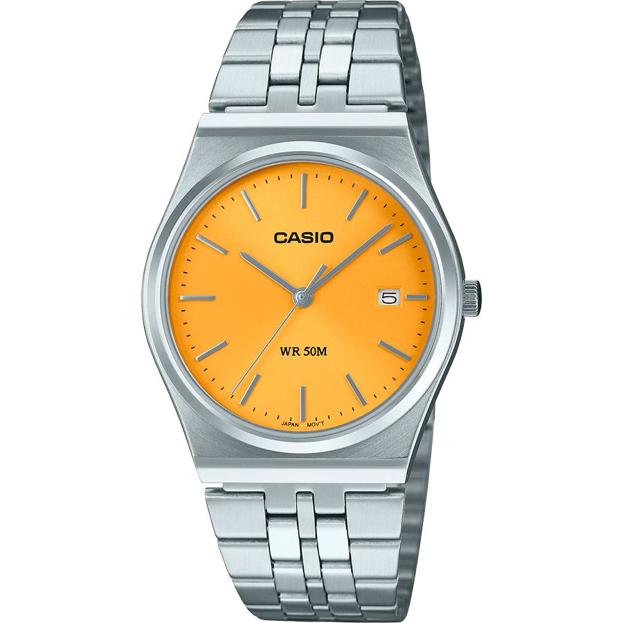 Кварцевые аналоговые наручные часы. Унисекс. Центральные часовая, минутная и секундная стрелки. Жёлтый циферблат с часовыми метками в виде штрихов. Окошко даты в позиции 3 ч. Устойчивое к мелким механическим повреждениям минеральное стекло. Круглый корпус из нержавеющей стали. Размеры корпуса 35x40мм, толщина 7,4мм. Батарейка рассчитана на 3 года. Браслет из нержавеющей стали с раскладывающейся застёжкой. Водонепроницаемость 50WR (мытьё рук, дождь). Вес около 82 г.