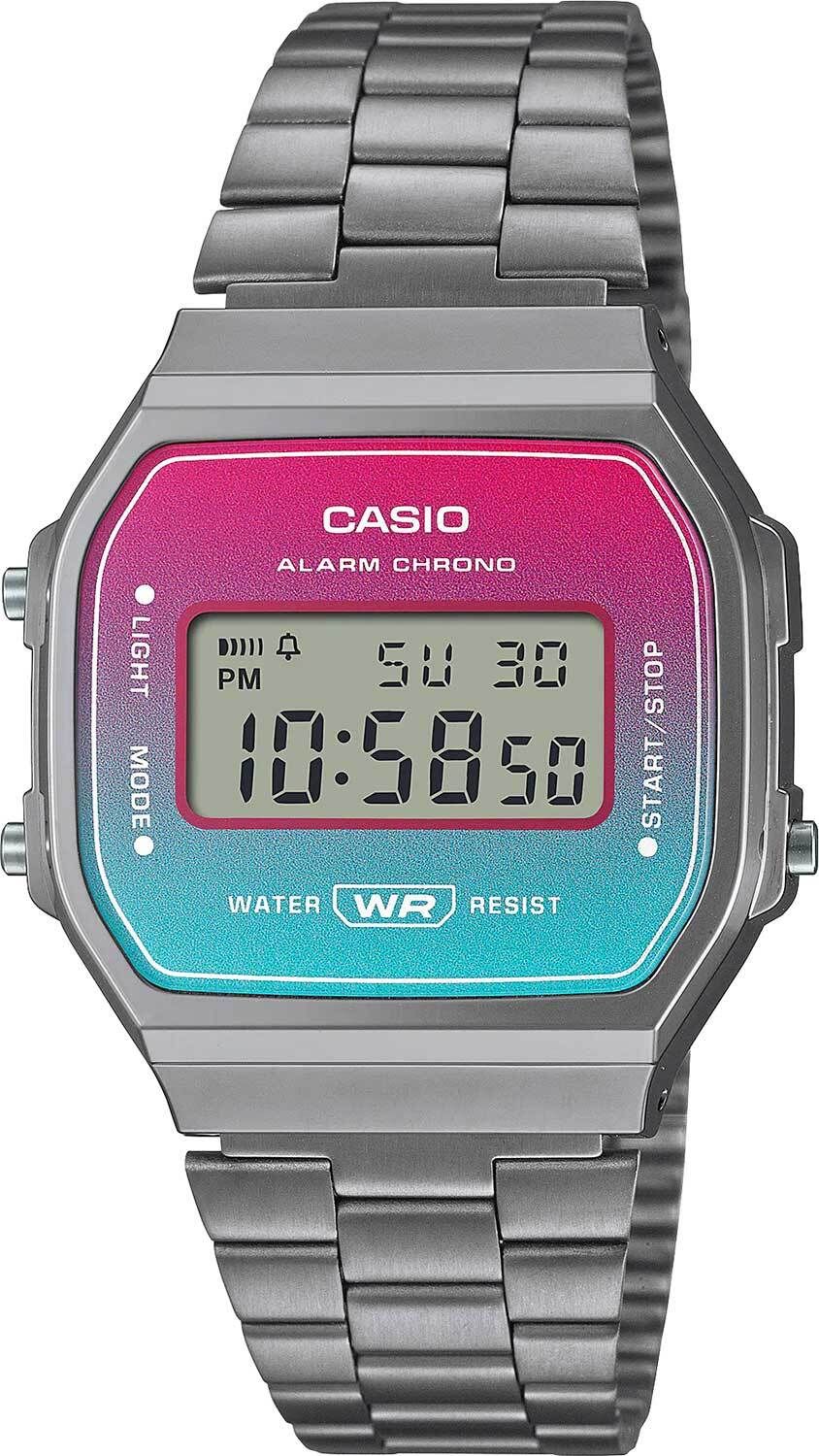 Электронные часы. Цветной розово-голубой циферблат. Электролюминесцентная подсветка. Функция секундомера с точностью 1/100 секунды и пределом измерения 1 час. Ежедневный будильник. Автоматический календарь. 12/24х часовой формат времени. Корпус выполнен из полимерного пластика серого цвета. Размер корпуса составляет 38,6 x 36,3 x 9,6 мм. Стальной браслет с серым IP покрытием, раскладывающаяся застежка. Акриловое стекло. Водостойкие (брызги). Вес примерно 49 гр.