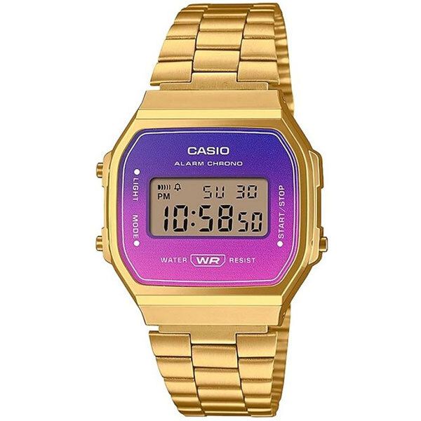 Электронные часы. Цветной фиолетово-розовый циферблат. Электролюминесцентная подсветка. Функция секундомера с точностью 1/100 секунды и пределом измерения 1 час. Ежедневный будильник. Автоматический календарь. 12/24х часовой формат времени. Корпус выполнен из полимерного пластика золотистого цвета. Размер корпуса составляет 38,6 x 36,3 x 9,6 мм. Стальной браслет с золотистым IP покрытием, раскладывающаяся застежка. Акриловое стекло. Водостойкие (брызги). Вес примерно 49 гр.