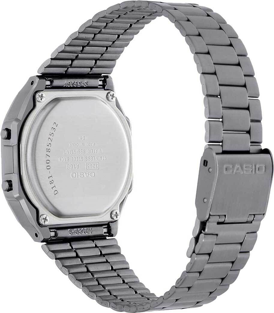 Электронные кварцевые наручные часы. Коллекция Casio Vintage. Унисекс часы. Электролюминесцентная подсветка обеспечивает равномерное освещение всего дисплея. 12-ти и 24-х часовой формат отображения времени. Секундомер с точностью 1/100 секунды и пределом измерения 1 час. Режимы измерения: чистое время, промежуточное время, два финишных результата. Ежедневный будильник, сигнал начала каждого часа. Автоматический календарь с установкой 28 дней на февраль. Прямоугольный корпус из полимерного пластика серого цвета. Размеры корпуса 36,3 мм на 38,6 мм, толщина 9,6 мм. Пластиковое стекло. Браслет из нержавеющей стали с IP покрытием серого цвета, регулируемая застежка. Срок службы батареи около 7 лет. Водонепроницаемость WR30 (защита от брызг). Вес около 49 г.