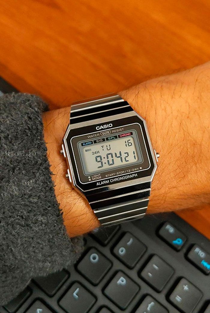 Электронные кварцевые наручные часы на каждый день в популярном ретро-стиле. Коллекция Vintage. Унисекс часы. Ультратонкие часы. Циферблат подсвечивается светодиодом. 12-ти и 24-х часовой формат отображения времени. Секундомер с точностью показаний 1/100 секунды и временем измерения 1 час. Режимы измерения: прошедшее время, промежуточное время, два финишных результата. Ежедневный будильник, сигнал начала каждого часа. Автоматический календарь с установкой 28 дней на февраль. Прямоугольный корпус из полимерного пластика серебристого цвета. Размеры корпуса 35,5 мм на 37,4 мм, толщина 6 мм. Устойчивое к мелким механическим повреждениям минеральное стекло. Браслет из нержавеющей стали с регулируемой застежкой. Батарейка рассчитана на 3 года. Водонепроницаемость WR30 (защита от брызг). Вес около 50 г.