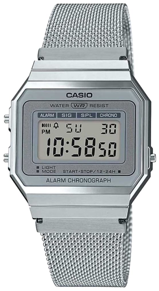 Электронные кварцевые наручные часы. Коллекция Casio Vintage. Унисекс часы. Циферблат подсвечивается светодиодом. 12-ти и 24-х часовой формат отображения времени. Секундомер с точностью показаний 1/100 секунды и временем измерения 1 час. Режимы измерения: прошедшее время, промежуточное время, два финишных результата. Ежедневный будильник, сигнал начала каждого часа. Автоматический календарь с установкой 28 дней на февраль. Прямоугольный корпус из полимерного пластика серебристого цвета. Размеры корпуса 35,5 мм на 37,4 мм, толщина 6 мм. Пластиковое стекло. Браслет из нержавеющей стали миланского плетения с регулируемой застежкой. Срок службы батареи около 3 лет. Водонепроницаемость WR30 (защита от брызг). Вес около 50 г.