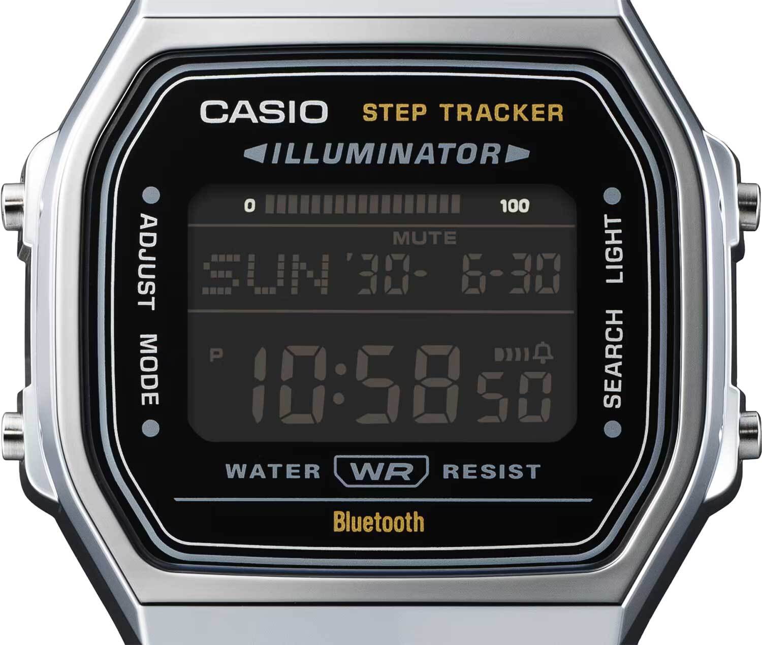 Электронные кварцевые наручные часы. Коллекция Casio Vintage. Унисекс. Циферблат подсвечивается светодиодом. Настраиваемое послесвечение 1,5 или 3с. Второй часовой пояс. Секундомер с точностью показаний 1/100с (до 1ч) и 1с (после 1ч) и временем измерения 24ч. Режимы измерения: прошедшее время, время круга, промежуточное время. Память на 200 этапов (дата, время, время круга). Таймер обратного отсчета от 1с до 1ч. 5 ежедневных будильников, ежечасный сигнал. 12/24-часовой формат отображения времени. Автоматический календарь до 2099 года. Шагомер измеряет количество шагов от 0 до 999999. Установка цели в диапазоне от 1000 до 50000 шагов. Звуковое напоминание об отсутствии активности и достижении цели. Отображение пройденных шагов за последние 7ч на 6-ти уровневом графике. Часы оснащены беспроводной технологией Bluetooth® со сверхнизким потреблением энергии для синхронизации со смартфоном. При подключении к смартфону часы автоматически корректируют текущее время и получают доступ к ряду полезных функций. Функция отключения/включения звука кнопок. Функция поиска телефона. Функция энергосбережения и оповещения о низком заряде батареи. Батарея рассчитана на 2 года. Восьмиугольный корпус из полимерного пластика серебристого цвета. Размеры корпуса 37,9 мм на 41,6мм, толщина 8,2 мм. Пластиковое стекло. Стальной браслет с регулируемой застежкой. Водостойкость WR 30 (брызги). Вес около 60 г.