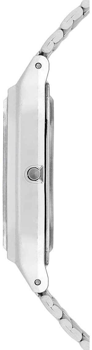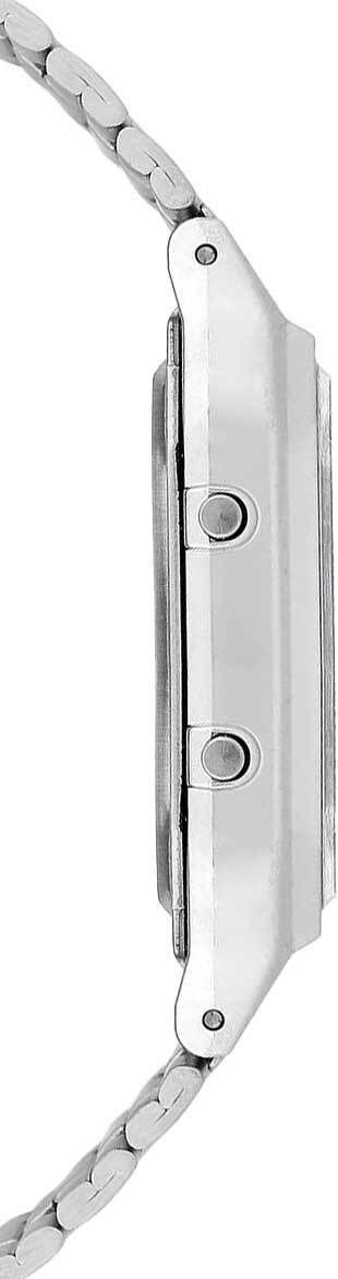Аналого-цифровые кварцевые наручные часы. Коллекция Casio Vintage. Унисекс. Центральные часовая и минутная стрелки. Зелёный циферблат с часовыми метками в виде штрихов. Второй часовой пояс. Двойное время. Одновременное отображение текущего времени в двух разных часовых поясах. Секундомер с точностью показаний 1/100с и временем измерения 1ч. 12-ти и 24-х часовой формат отображения времени. Ежедневный будильник, индикация начала часа. Автоматический календарь с установкой 28 дней на февраль. Прямоугольный корпус из полимерного пластика. Размеры корпуса 27,8 мм на 38,8 мм, толщина 8,1 мм. Пластиковое стекло. Стальной браслет с раскладывающейся застежкой. Срок службы батареи около 3-х лет. Водостойкость WR 30 (брызги). Вес около 47 г.