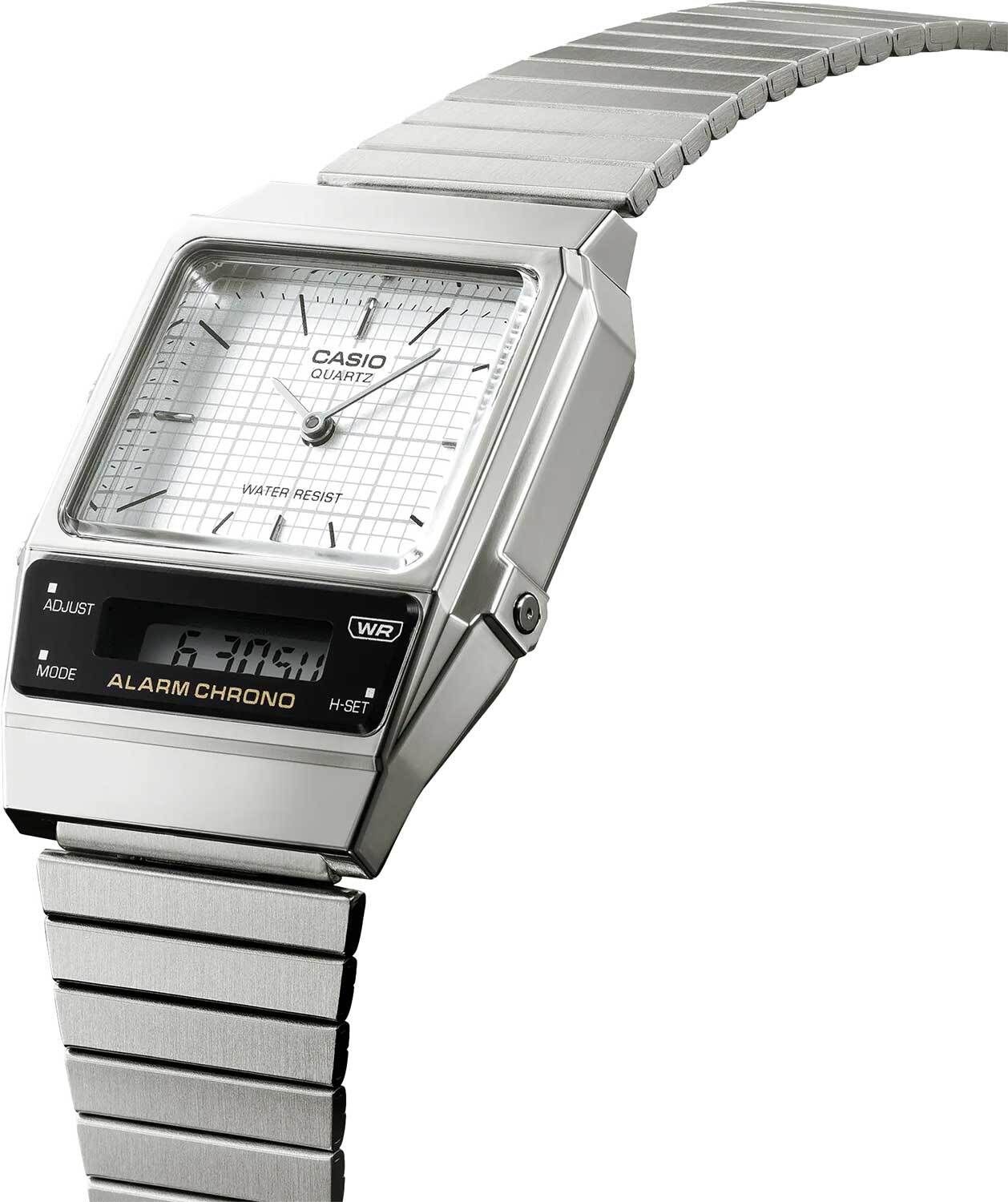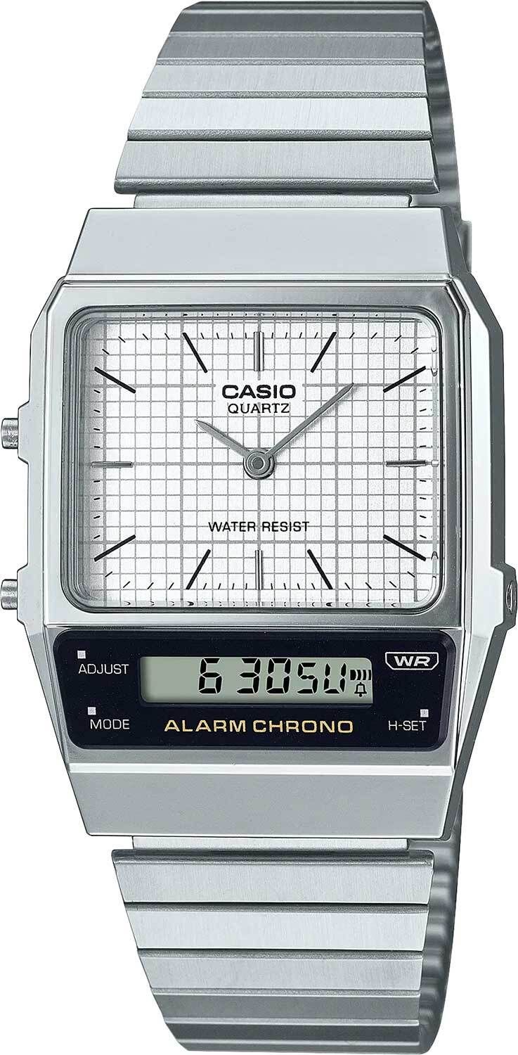 Аналого-цифровые кварцевые наручные часы. Унисекс часы. Коллекция Casio Vintage. Центральные часовая и минутная стрелки. Белый циферблат с часовыми метками в виде штрихов. Второй часовой пояс — возможность одновременного отображения текущего времени в двух разных часовых поясах. Секундомер с точностью показаний 1/100с и временем измерения 1ч. 12-ти и 24-х часовой формат отображения времени. Ежедневный будильник, индикация начала часа. Автоматический календарь. Прямоугольный корпус из полимерного пластика серебристого цвета. Размер корпуса 32,1 мм на 40,7 мм, толщина 8,7 мм. Пластиковое стекло. Браслет из нержавеющей стали с регулируемой застежкой. Батарея рассчитана на 3 года. Водонепроницаемость 30WR (защита от брызг). Вес около 52 г.
