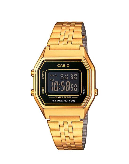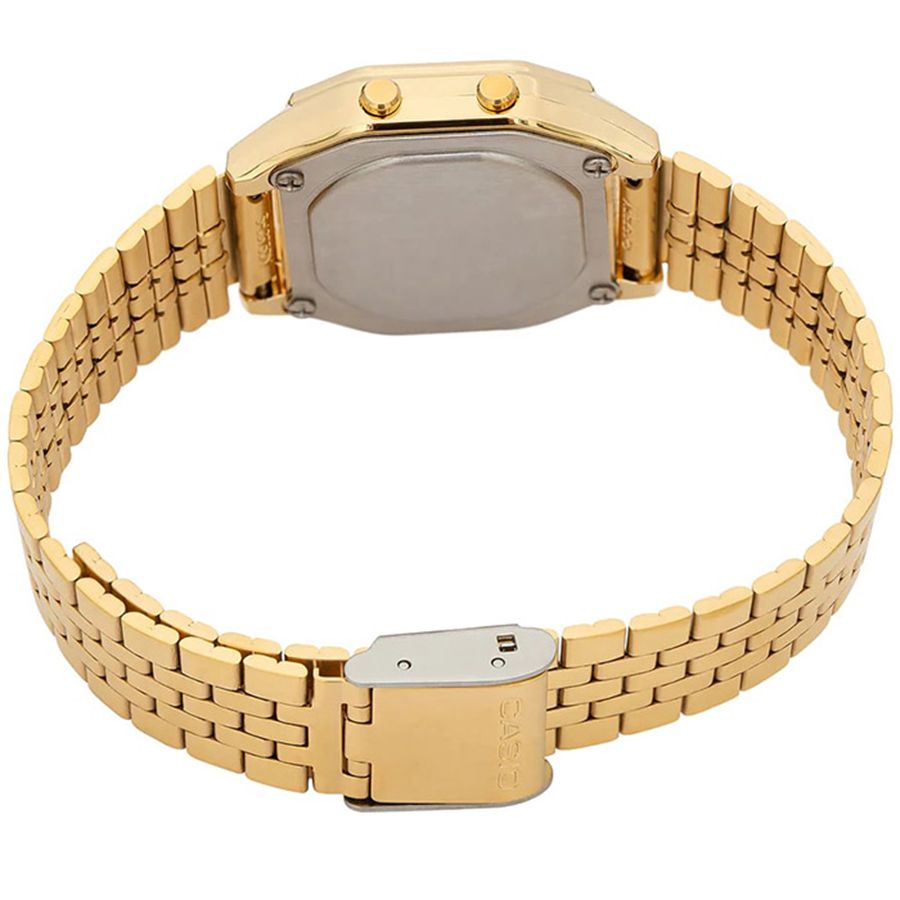 Женские кварцевые наручные часы на каждый день в популярном ретро-стиле Iconic c цифровым отображением времени. Коллекция Vintage. Циферблат подсвечивается светодиодом. 12-ти и 24-х часовой формат отображения времени. Секундомер с точностью показаний 1/100 секунды и временем измерения 1 час. Режимы измерения: прошедшее время, промежуточное время, два финишных результата. Ежедневный будильник, сигнал начала часа. Автоматический календарь, учитывающий 28 дней в феврале. Прямоугольный корпус из полимерного пластика золотистого цвета. Размеры корпуса 28,6 мм на 33,5мм, толщина 8,6мм. Пластиковое стекло. Инверсионный дисплей (темный фон со светлой индикацией на нем). Стальной браслет с IP покрытием цвета розового золота, регулируемая застежка. Батарея рассчитана на 5 лет. Водонепроницаемость 30WR (защита от брызг). Вес около 36 г.