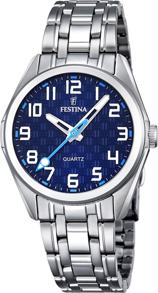Кварцевые аналоговые наручные часы. Серия Festina Junior. Унисекс. Круглый стальной корпус. Арабские цифры. Центральная синяя секундная стрелка. Стальной браслет.
